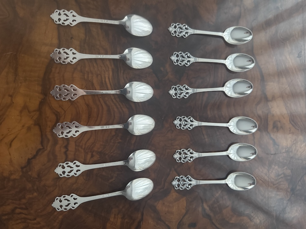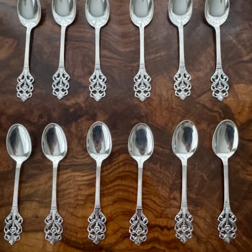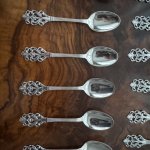 Прекрасный старинный комплект из 12 серебряных кофейных ложечек, красивых и изящных, клеймо Норвегии , 1900-х годов. На каждой ложечке проба серебра 830 S . Длина 11,5 см, вес 114 грамм. Хорошая сохранность. Цена указана за комплект(6 ложечек)
