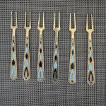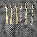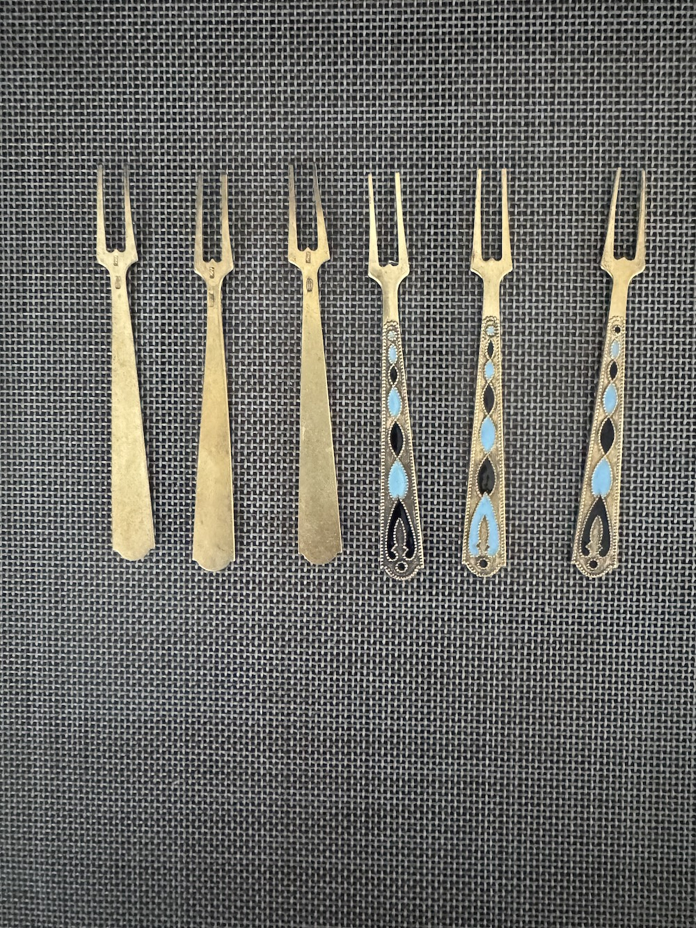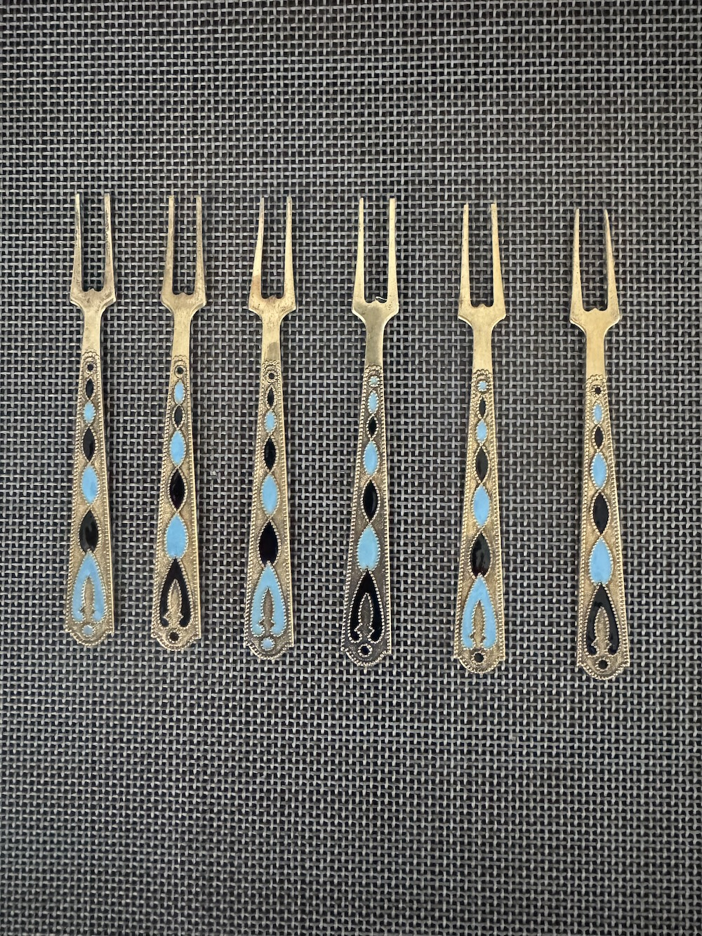 Комплект из 6 серебряных вилочек для для лимона или др. закусок советского периода 875 пробы Ленинградской ювелирно-часовой фабрики, с великолепной эмалью и не стертой позолотой. Вес 33,37 г. Длина = 9,4 см. Большая редкость, хорошее состояние. Четкие клейма 875 пробы со звездой и ЛЮЗ на каждом предмете.