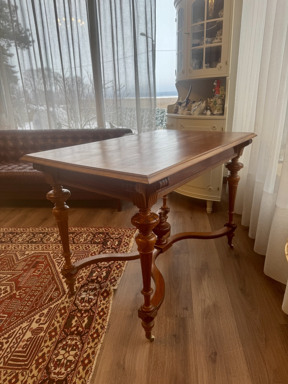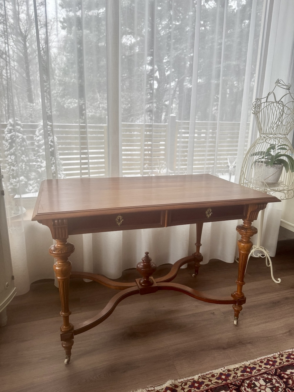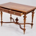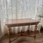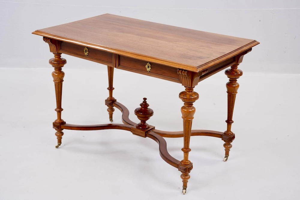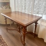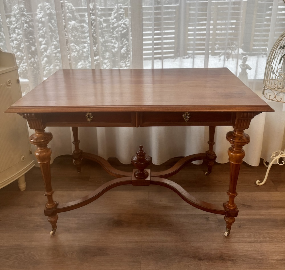 Прекрасный антикварный стол на колесиках с 2 выдвижными ящиками, красное дерево, 1850-1910-х годов, стиль неоренессанс, точеные ножки, ручной работы украшения. Подойдет как письменный стол, как обеденный, как салонный или библиотечный.