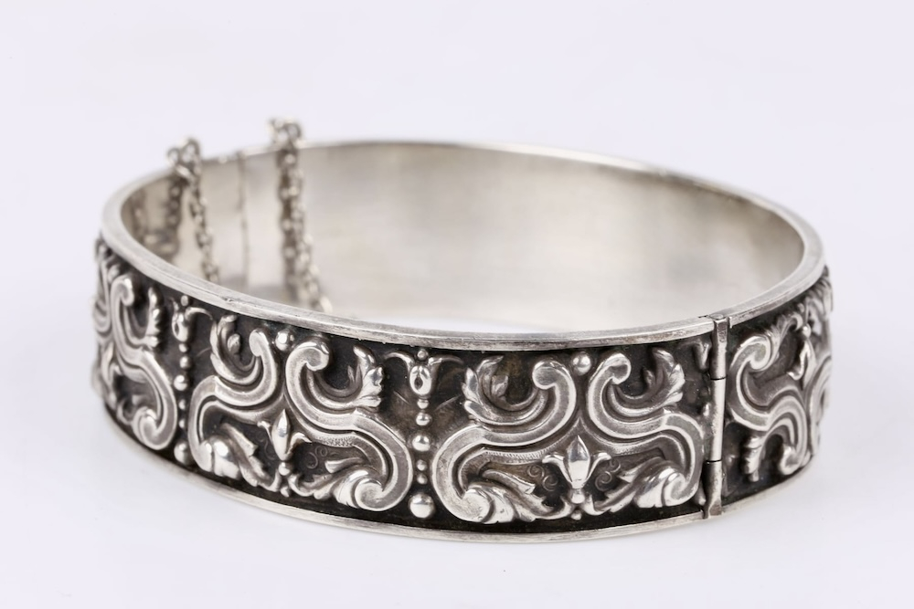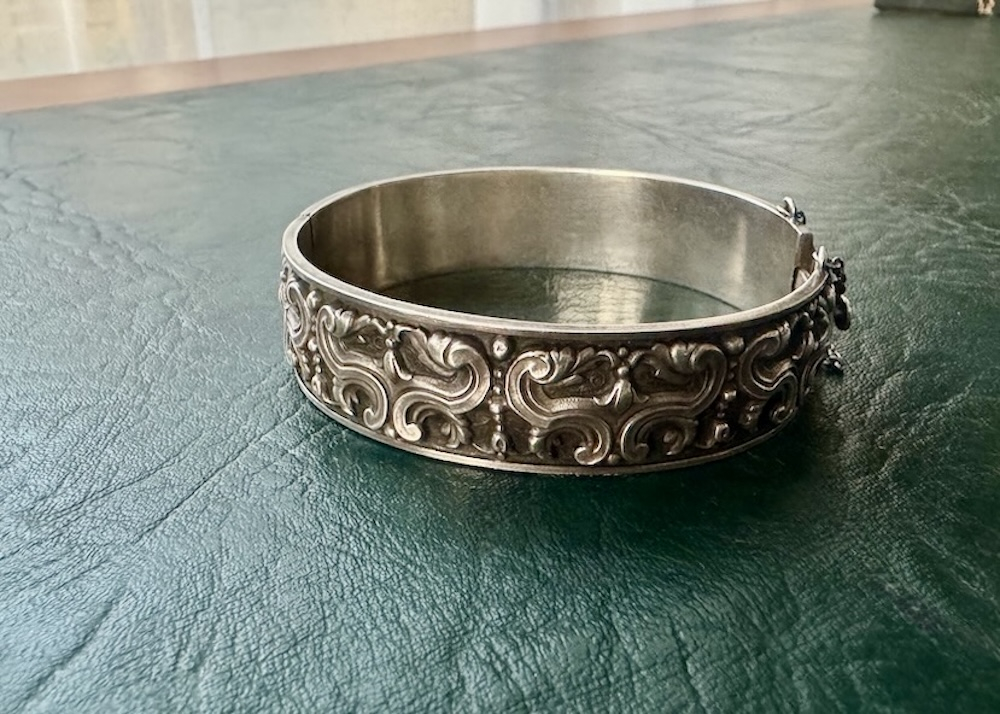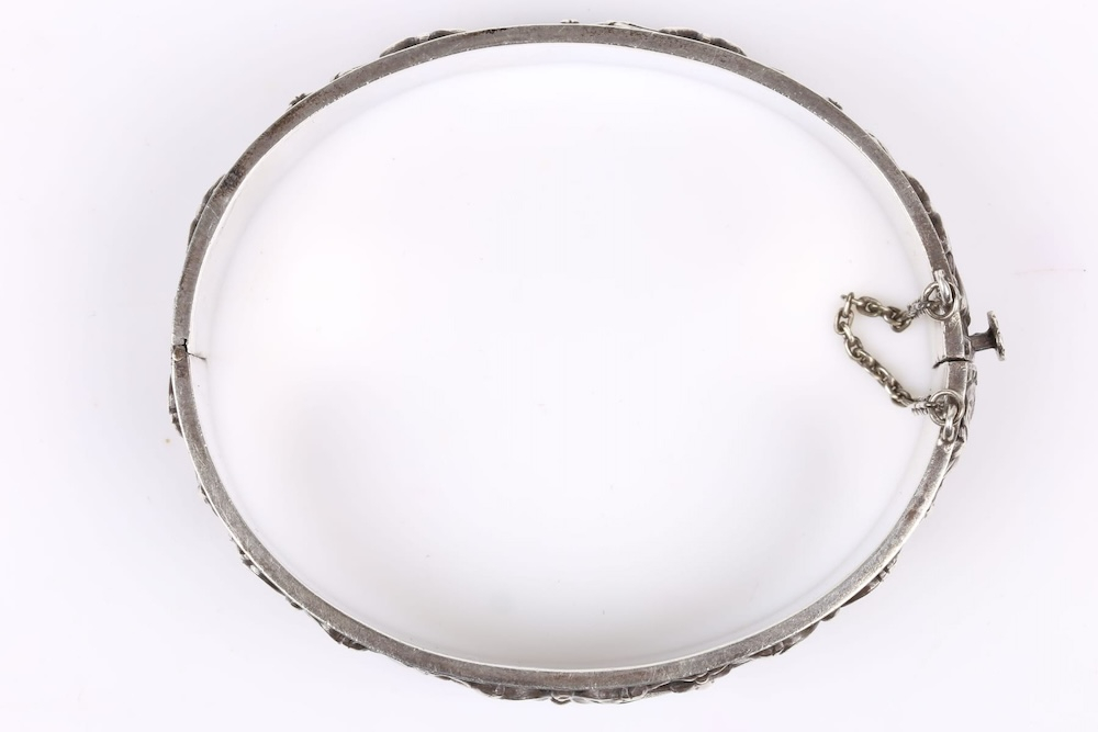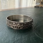 Великолепный старинный браслет из серебра с изысканным узором, ручной работы, с замком-клипсой и с предохранительной цепочкой. Вес 28 грамм, длина окружности 21-22 см ( размер М-N английский), ширина 1,9 см, клеймо серебра и ввозное клеймо Швеции