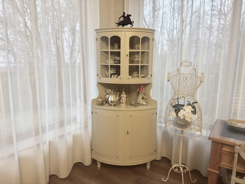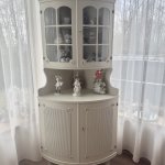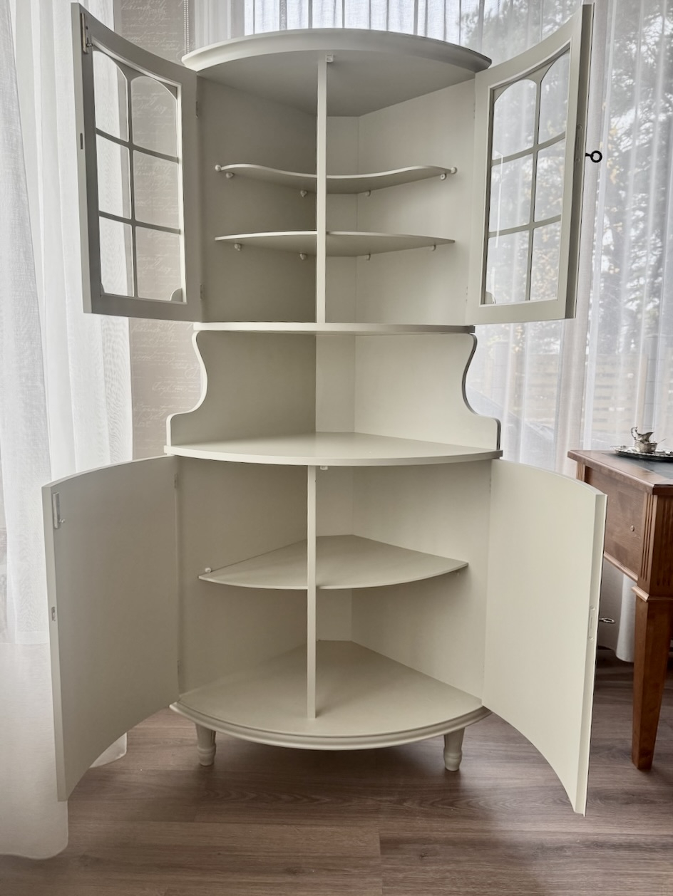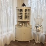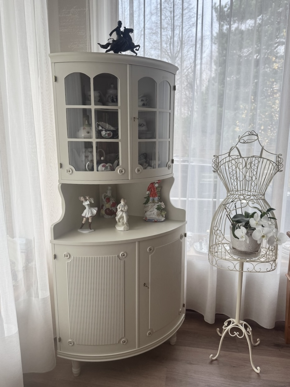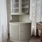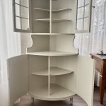 Элегантный угловой буфет ( витрина), середина 1900 -х, густавианский стиль, красивый скандинавский декор, витражи, застекленная верхняя часть, точеные ножки, декор. Высота 175 cм, ширина 87 см, глубина 51 см . Ключи в наличии.