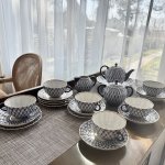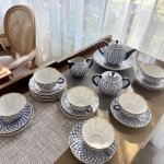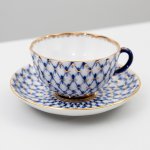 Чайный ( полный) сервиз знаменитого на весь мир рисунка, созданного в послеблокадном Ленинграде в 1944 году художницей Анной Яцкевич "Кобальтовая сетка", Ломоносовского завода с клеймом MADE IN USSR (делалось на экспорт ) на 6 персон (6 чашек, 6 блюдец) , чайник, молочник, сахарница, сухарница, а также 6 пирожковых тарелок. Объем чашек 250 мл, диаметр блюдца 15 см, объем чайника 700 мл. Ручная раскраска, не стертая позолота.