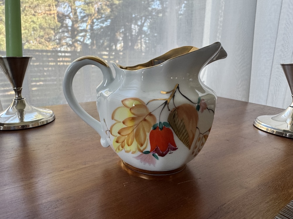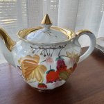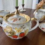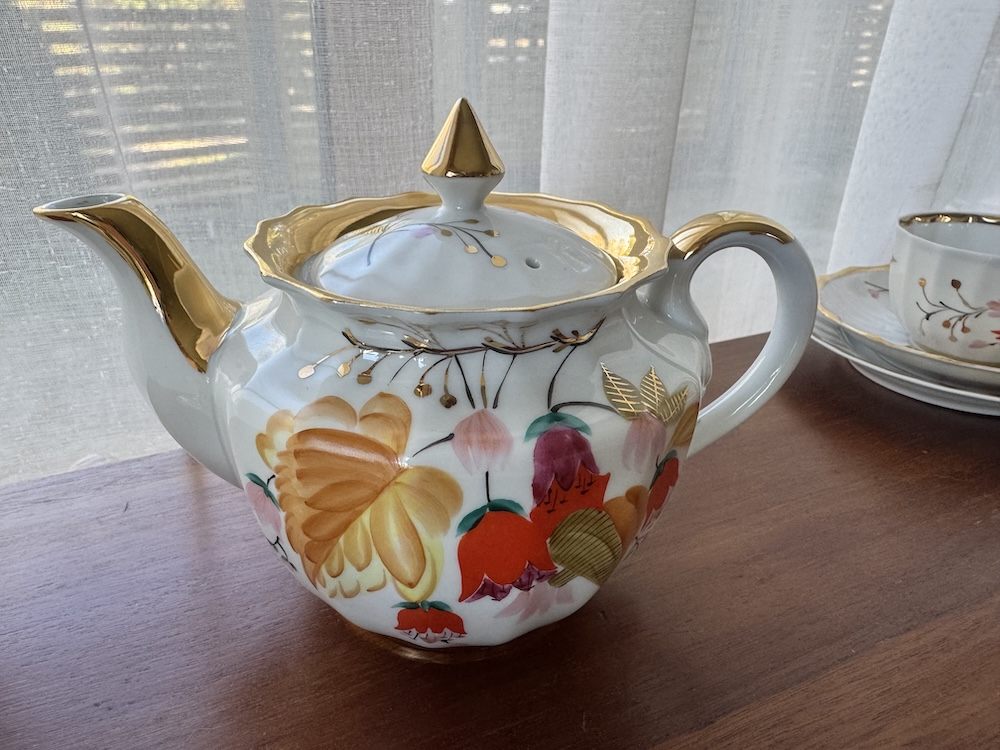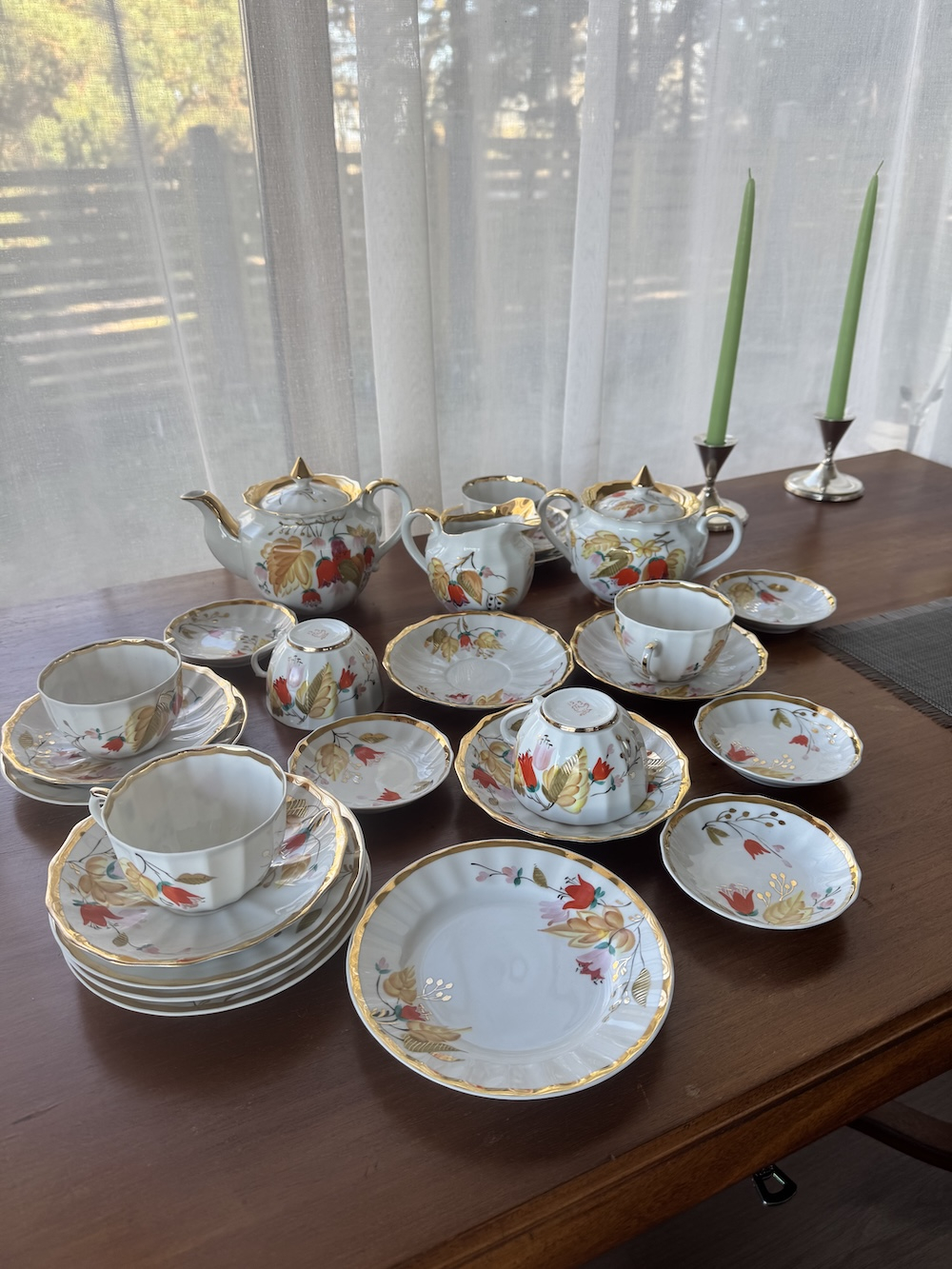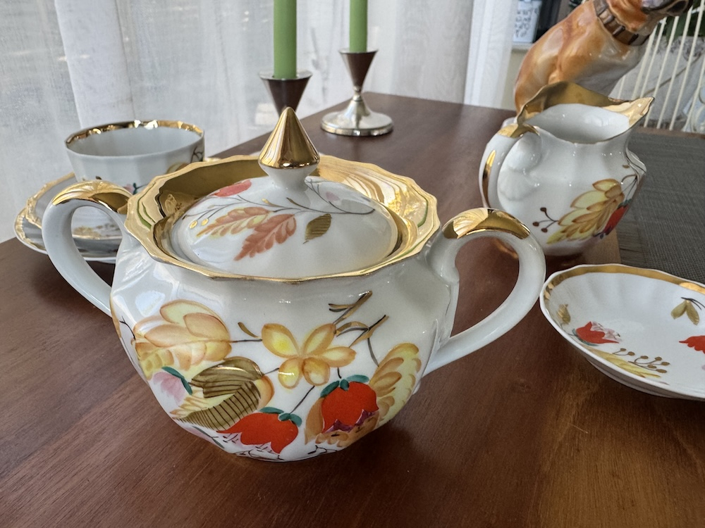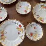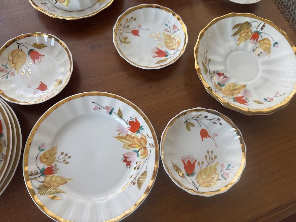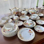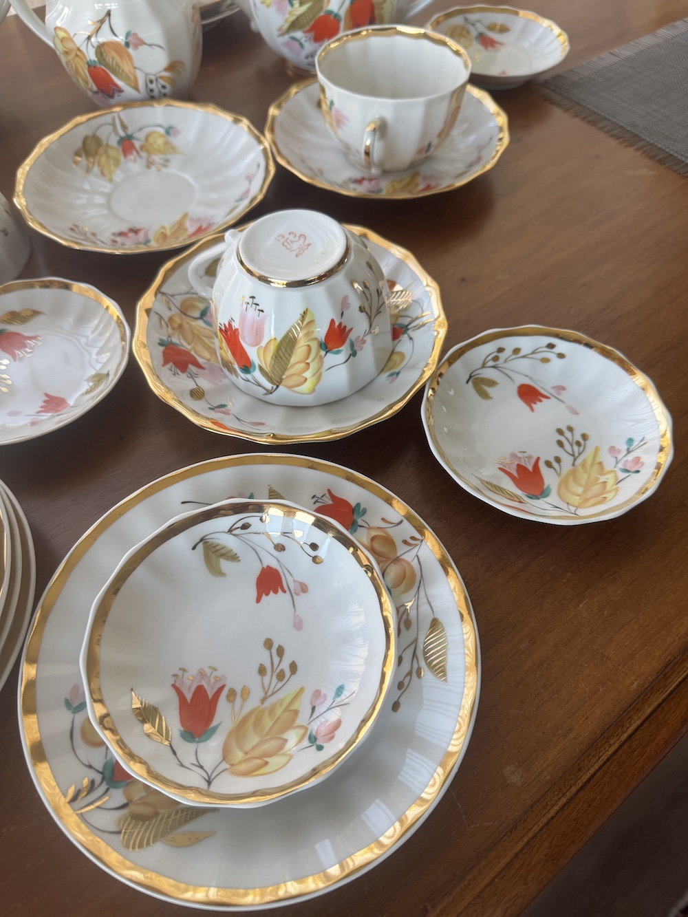 Великолепный тонкостенный фарфоровый Чайный сервиз на 6 персон "Цветы осени" или еще называют "Колокольчики ", ручная роспись, Золочение, ДФЗ Вербилки - Дмитровский фарфоровый завод, СССР, клеймо завода на всех предметах