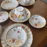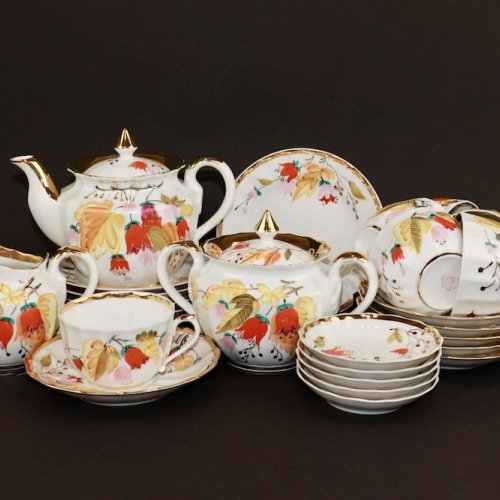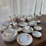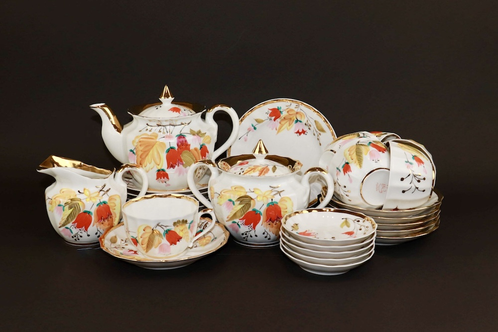 Сервиз состоит из 6 чашек, 6 блюдец, 6 пирожковых тарелок, дополнительных 5 маленьких тарелочек, а так же чайник, сливочник и сахарница. Выпускался с позолотой и без. Узор разработан художником Е. П. Смирновым в 1954 году, ручная роспись с большим количеством позолоты 24 карата .Сервиз полным набором с позолотой редкая коллекционная находка и эстетическое наслаждение. Даже в советский период считался предметом роскоши благодаря высокому качеству фарфора и богатой золотой отделке.