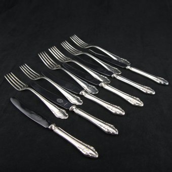 Дорожный антикварный комплект из серебряный столовых приборов в количестве 3 шт в футляре, рукоятки из серебра 800 пробы, Италия. Клинок из позолоченной стали. Длина ножа 20 см