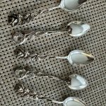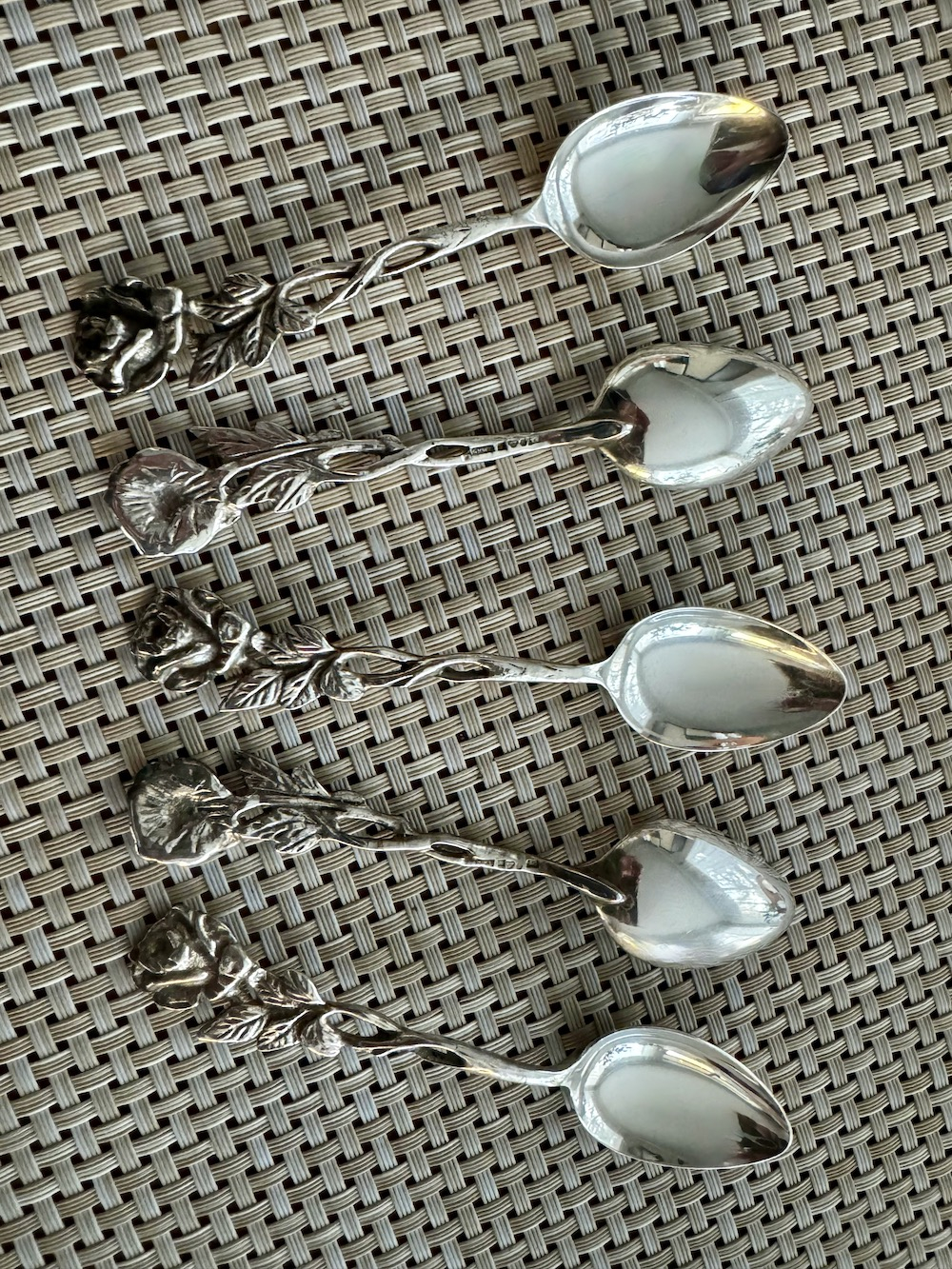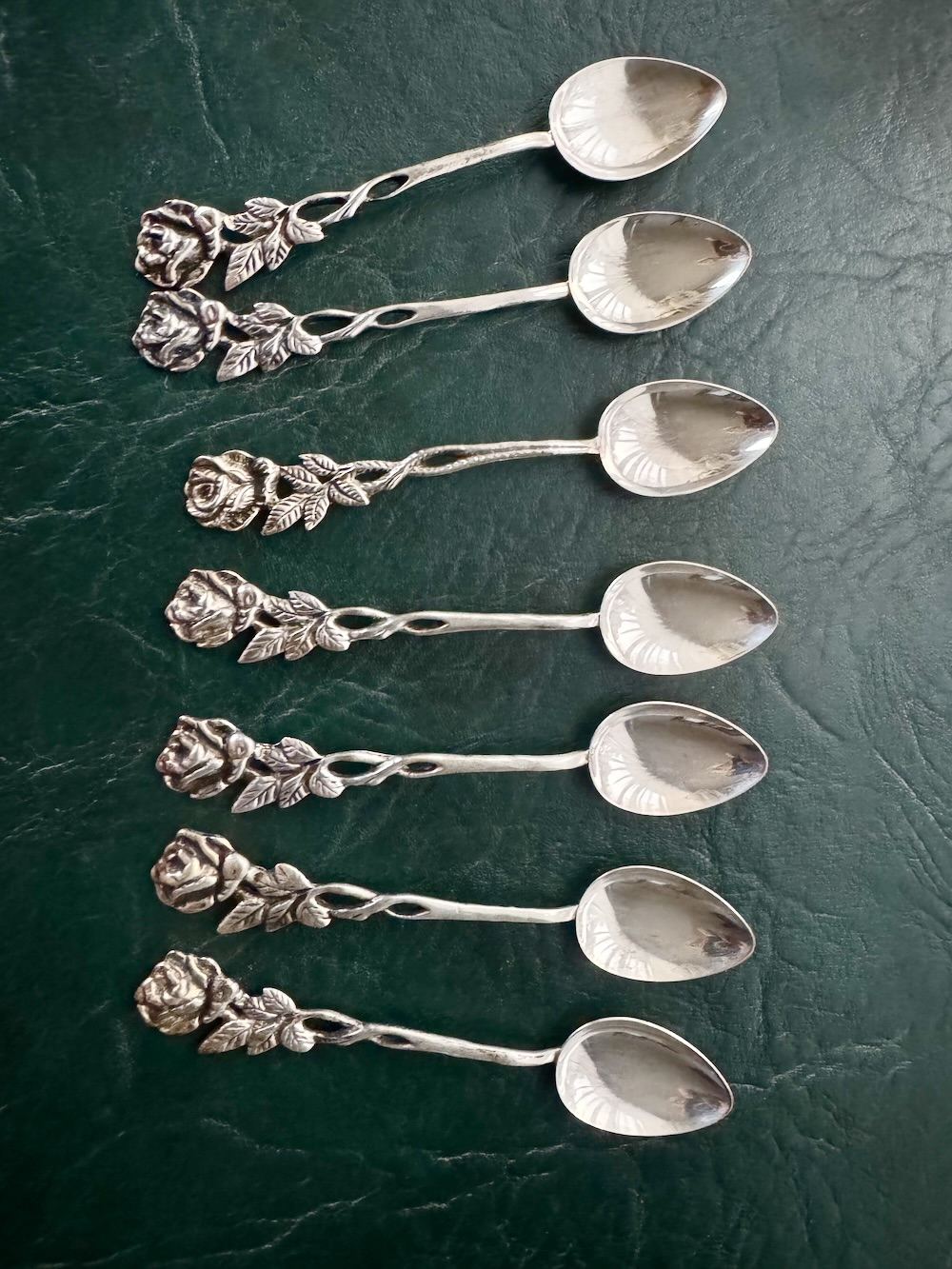 Прекрасный старинный комплект из 7 изящных серебряных кофейных ложечек (на 6 персон+ и ложечка для варенья), Швеция, модель всемирно известного дизайна «Хильдесхаймская роза», Gewe Malmö 1955 год , вес 80 грамм, длина 10 cм . На каждой ложечке клеймо серебра с клеймом года изготовления. Хорошая сохранность