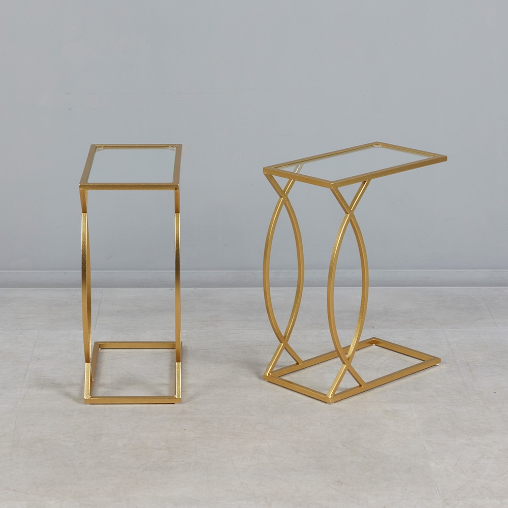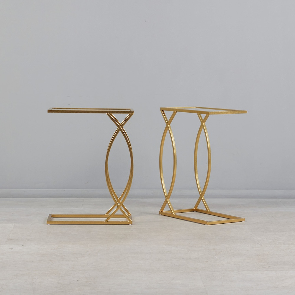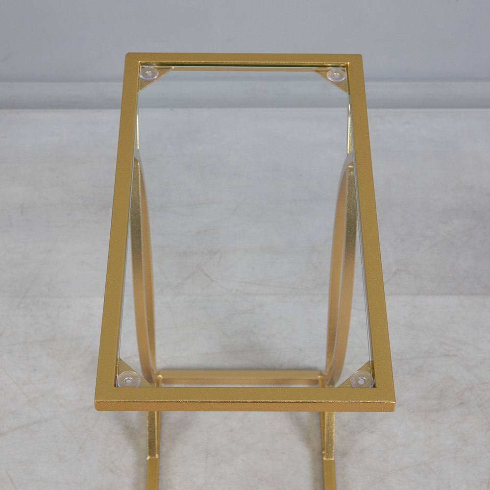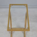 Пара винтажных приставных столика из позолоченного металла, сложной формы с изогнутыми ножками и стеклянной полкой каждая, высота 61 см, длина 45,5 см, ширина 25,5 см. Подойдут как консоли, прикроватные, придиванные, как сервировочные. Цена указана за один