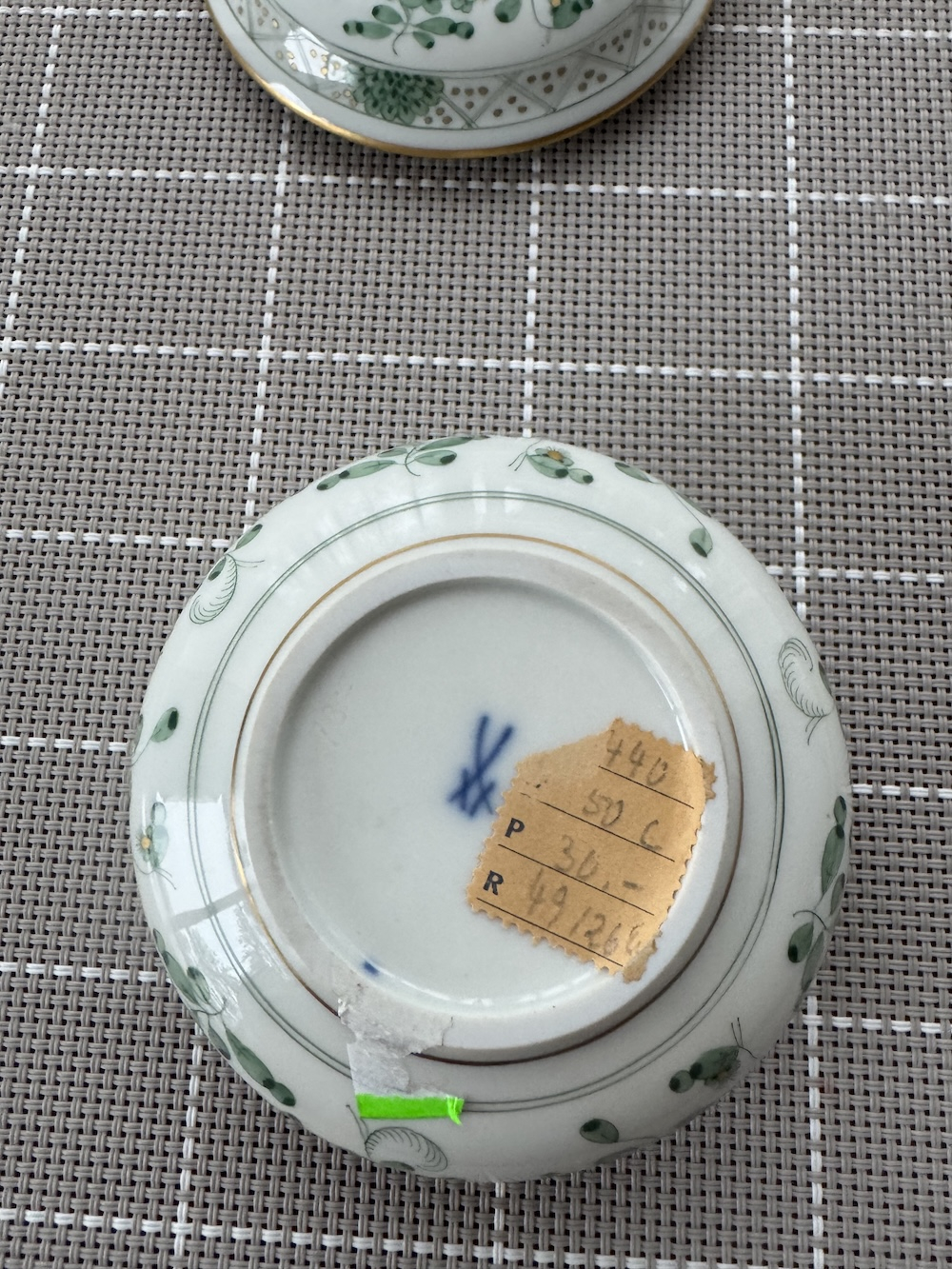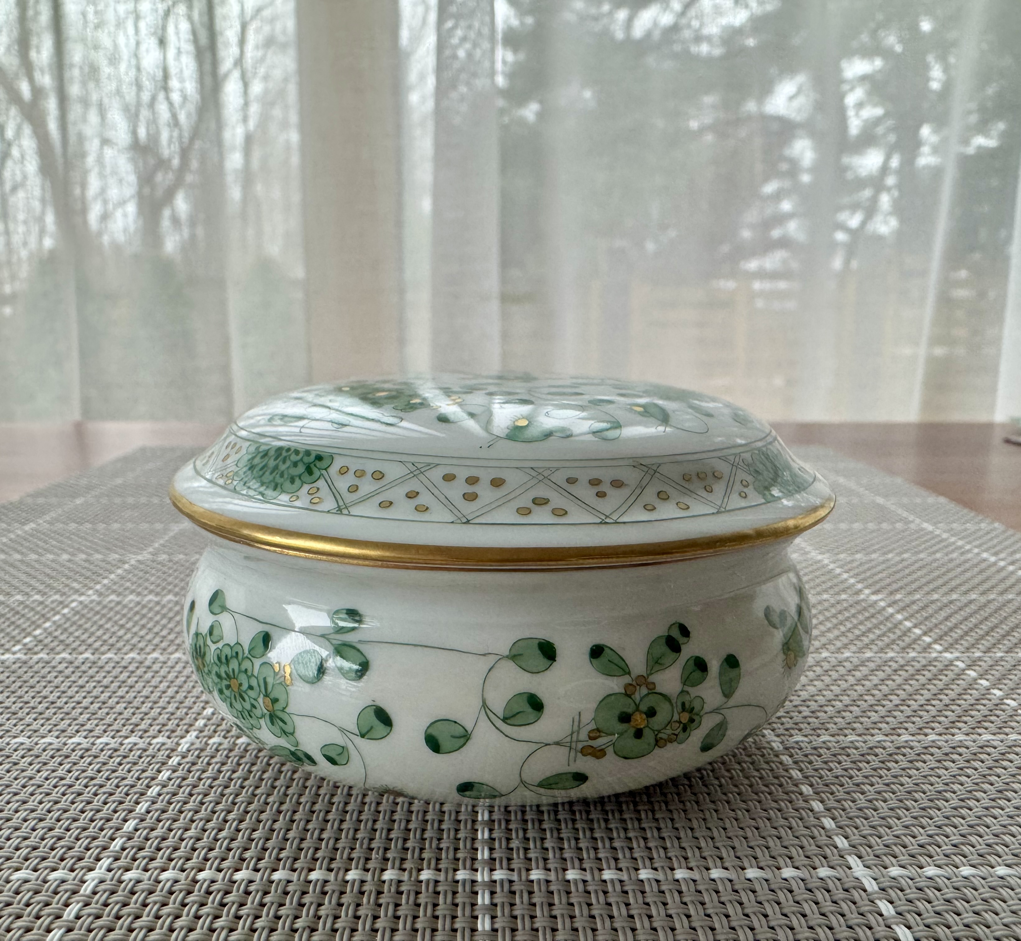 Декор: Узор «Зеленые индийские цветы» (Indian Green) с золотой росписью. Изделие выполнено из высококачественного фарфора. Диаметр: 9,5 см, высота: 6 см. Хорошее состояние.