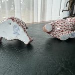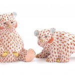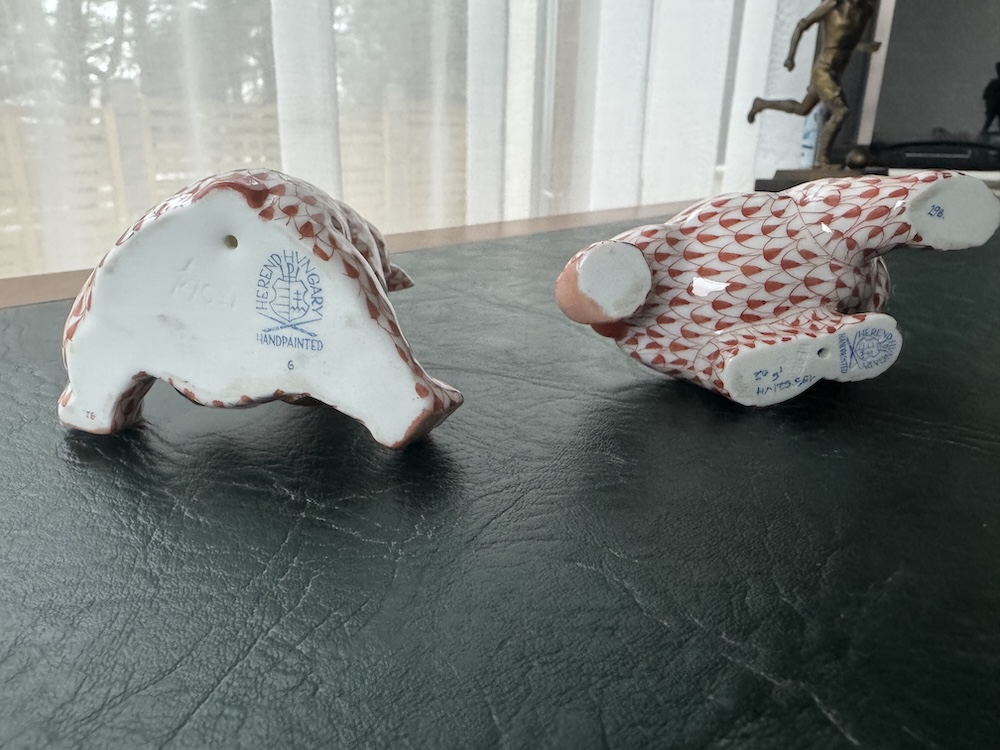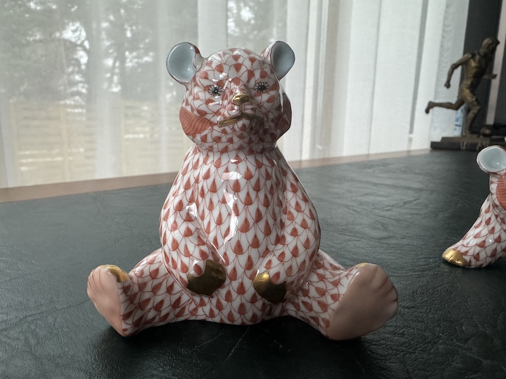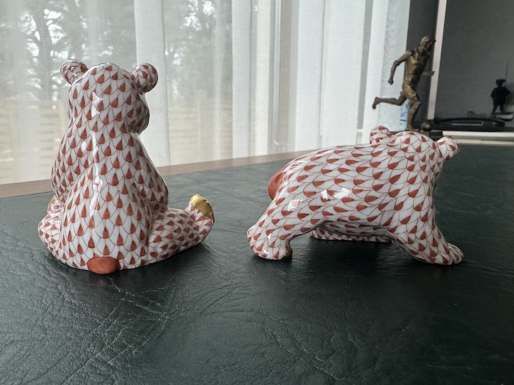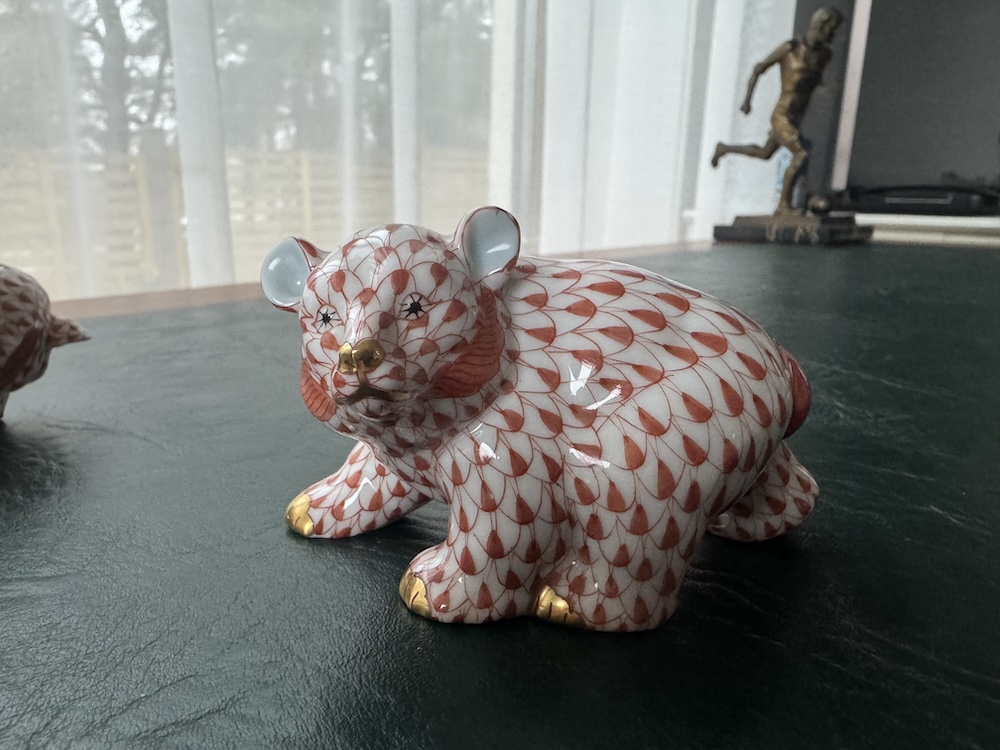 Редкая находка знаменитой мануфактуры Herend , два медвежонка "Baby Bear Sitting" и "Baby Bear Walking "c фирменным чешуйчатым узором с 24 каратным золотом . Подделать этот узор практически невозможно, поскольку узкие или расширяющиеся чешуйки можно нанести на неровные поверхности только вручную. Herend был поставщиком Королевского двора, а также изготавливал изделия для императора Франца-Иосифа, королевы Виктории, Ротшильдов и других представителей аристократии.