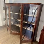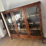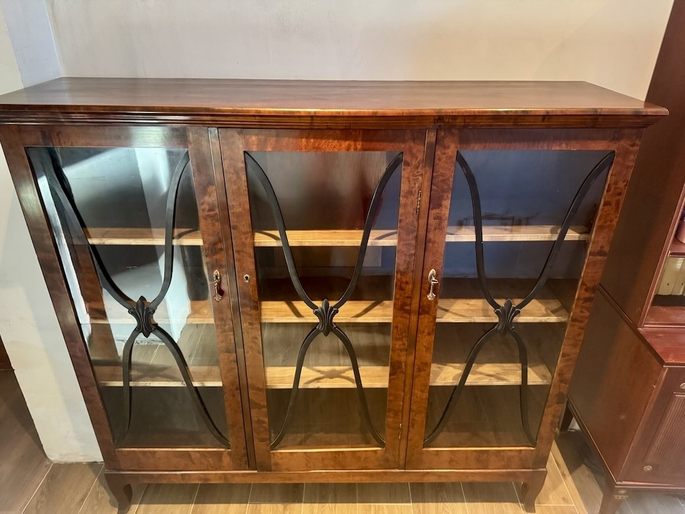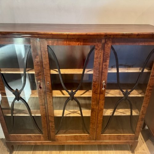 Антикварный книжный шкаф - витрина первой половины 1900-х годов горизонтального типа, редкая древесина пламенной березы, лаконичный дизайн с витражным остеклением. Высота 139 см, ширина 152 см, глубина 43 см