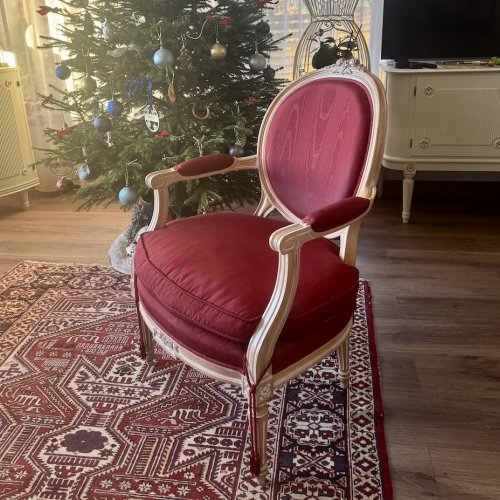 Удобное и элегантное кресло для отдыха с овальной спинкой в густавианском стиле , красивый декор с резьбой, прочная ткань, дерево, хорошее состояние, высота сиденья примерно 44 см, общая высота 94, ширина 64 см