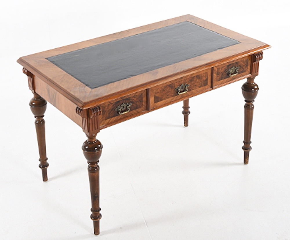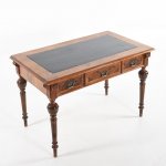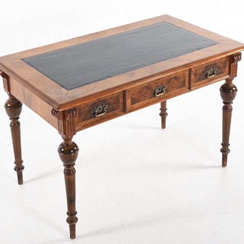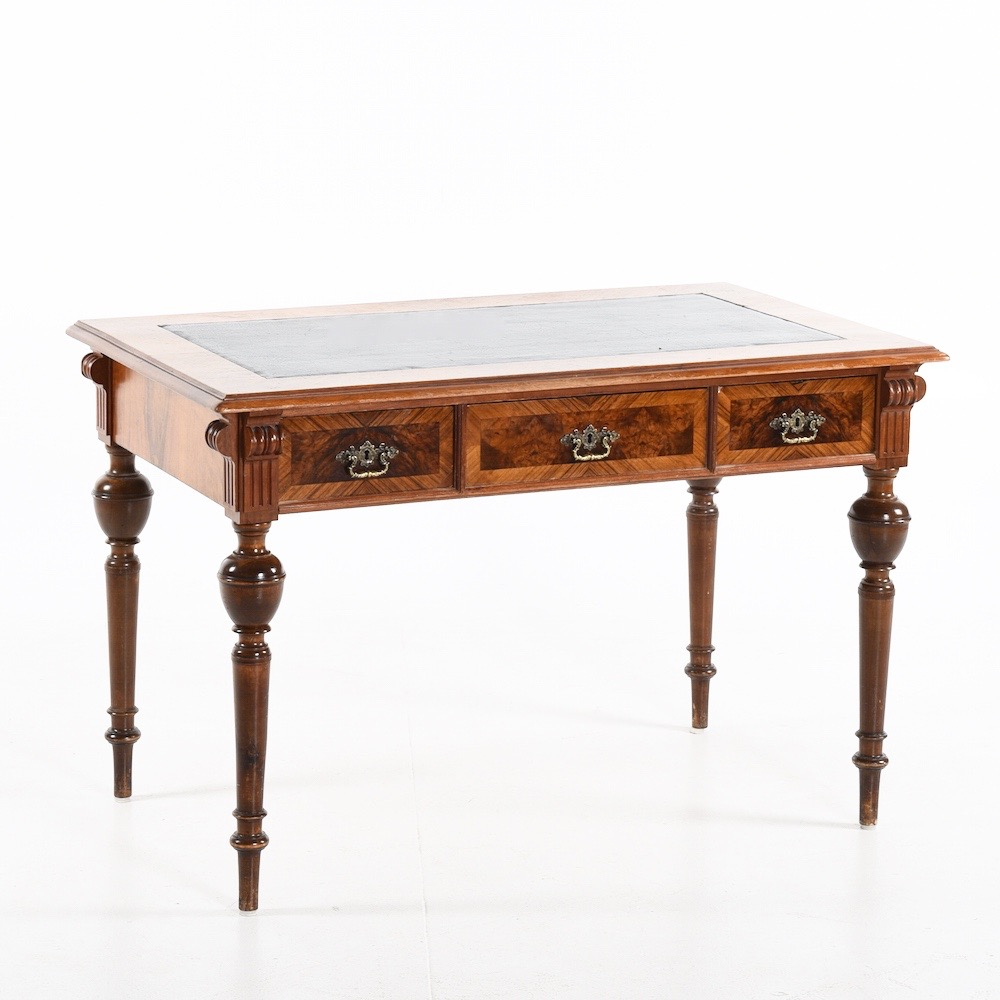 Antīks rakstāmgalds, 1800. gadi, neoklasicisms. Šis stils ir viegls, elegants, tiešs un piemērots jebkuram interjeram. Lieliska, sarežģīta pēdu grebšana, bronzas plāksnes, valrieksts , augstums 77 cm, platums 119 cm, dziļums 68 cm