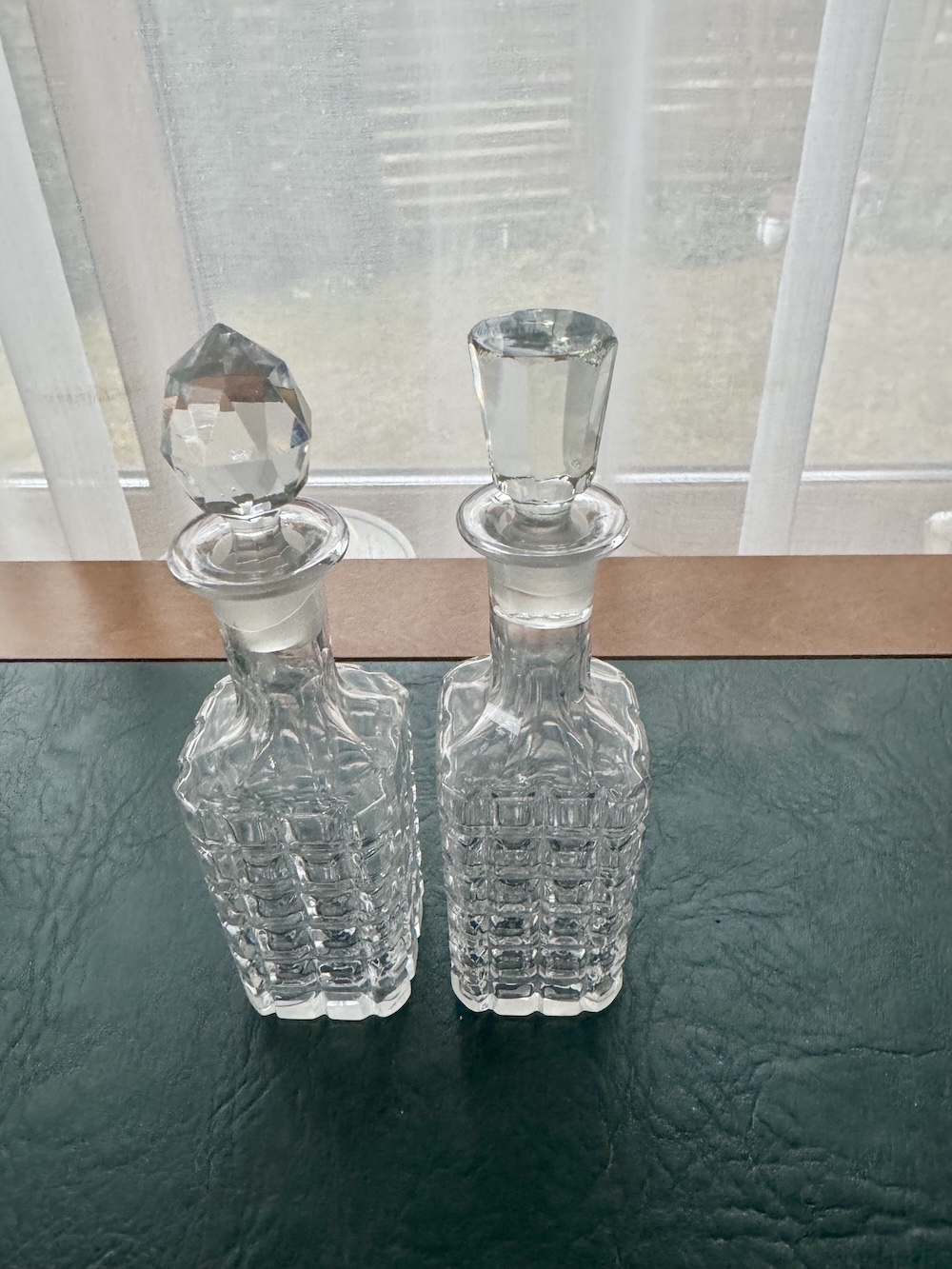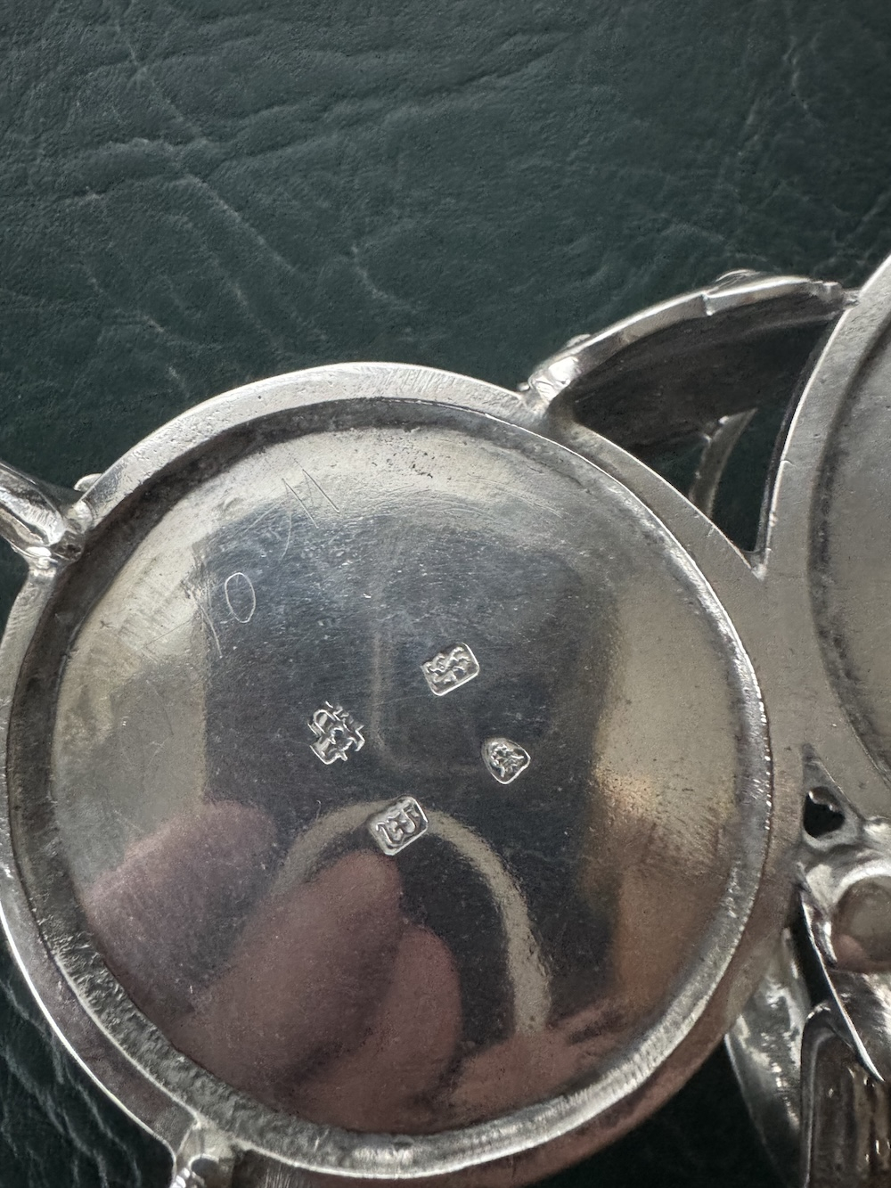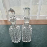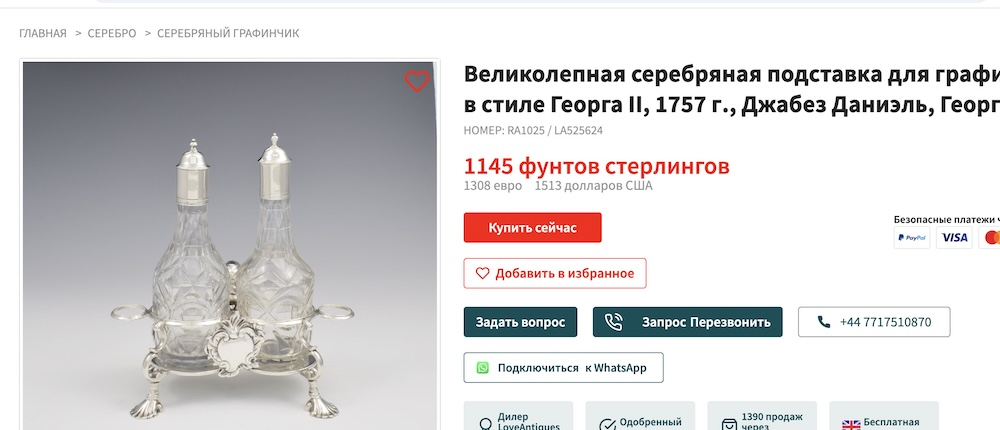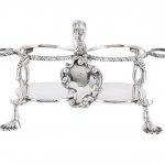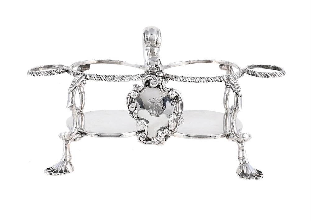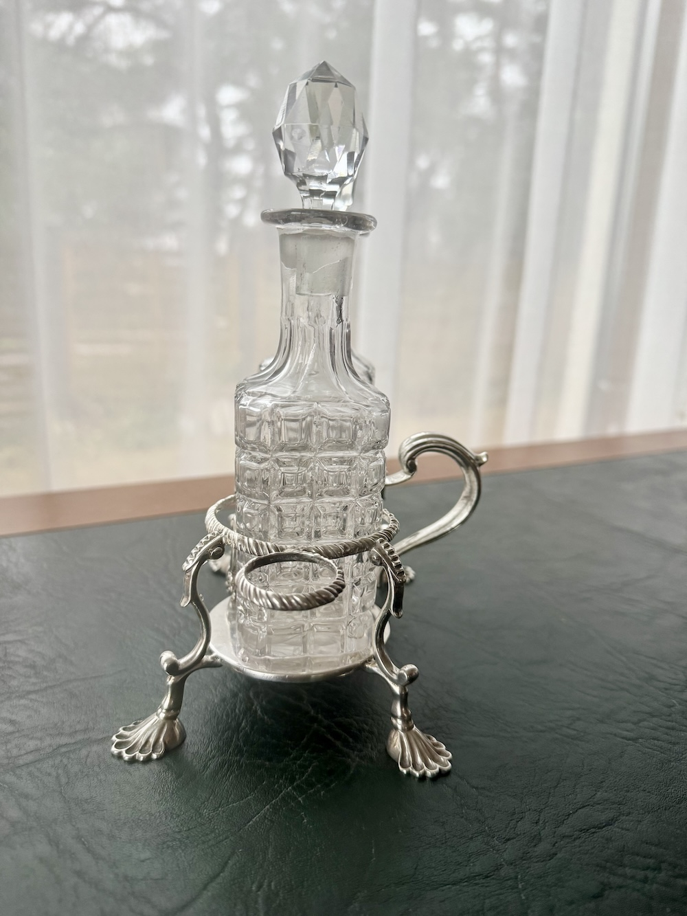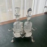 Antīks sudraba statīvs divām vecām kristāla pudelēm sviestam un etiķim no Džordža III laikmeta. Sudraba rāmis ir uzstādīts uz četrām savītām kājām-gliemežvākiem ar pamatnēm un rotājumiem malās, dubults spirālveida rokturis ar mēlīti aizmugurē, karte ar iegravētu emblēmu.