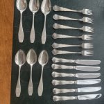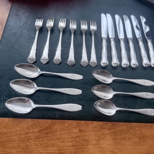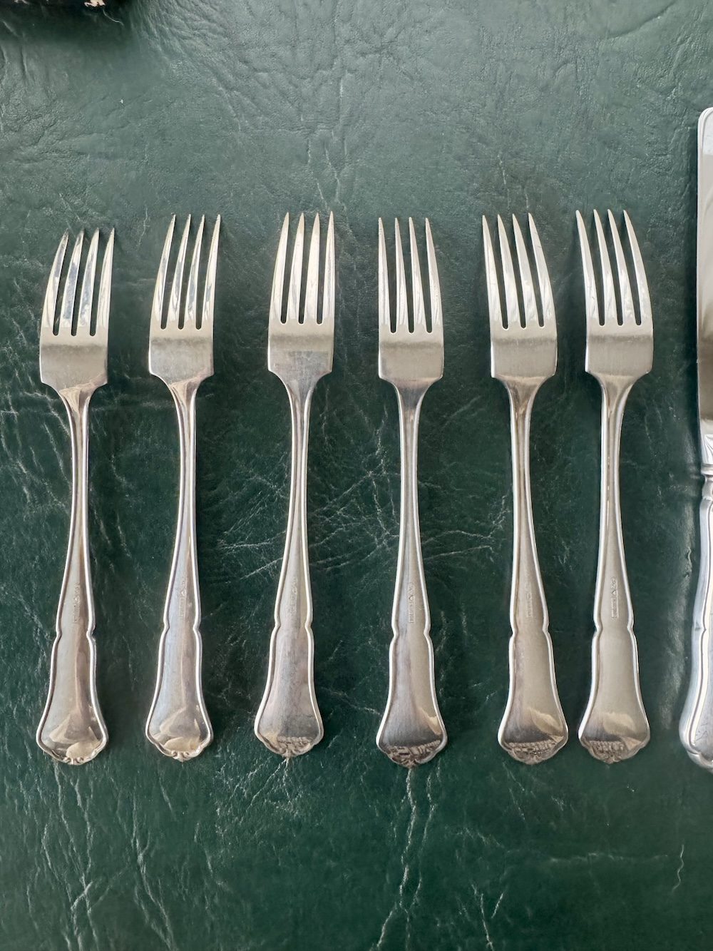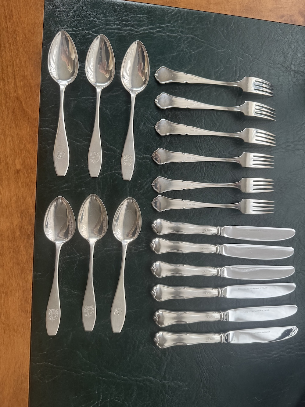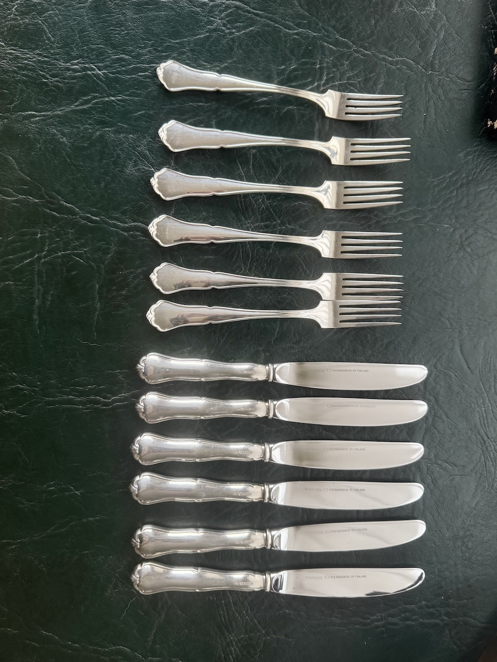 Pilns sudraba galda piederumu komplekts 6 personām: dakšiņas, karotes un naži. Ražots Somijā. Garums: 19-16,5 cm. Kopējais svars: 683 grami. Visām detaļām ir proves zīmes. Labā stāvoklī. Nerūsējošā tērauda asmeņi, sudraba rokturi.
