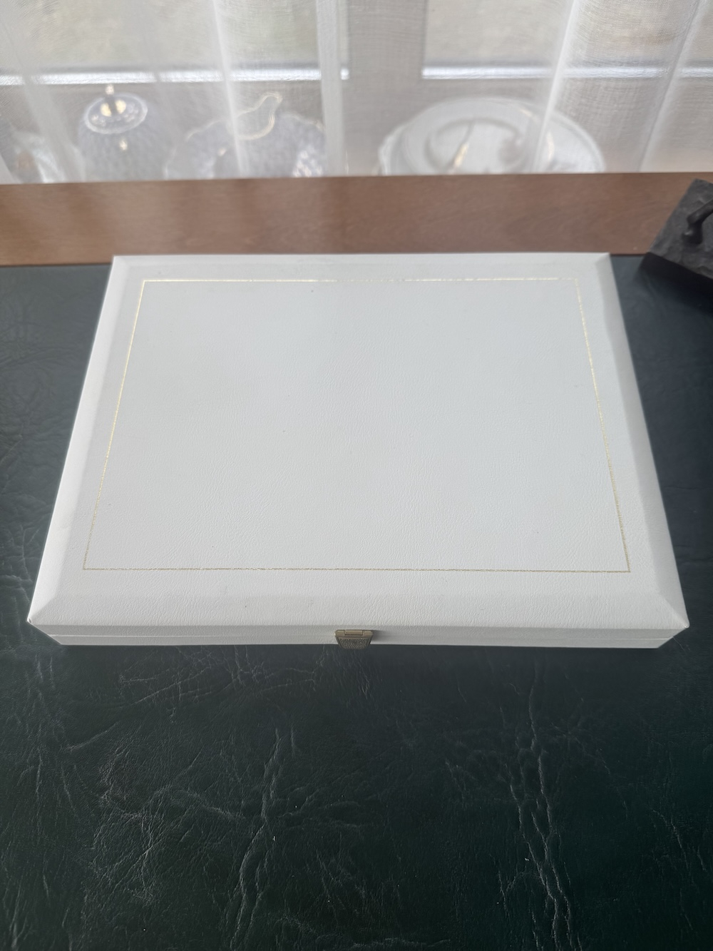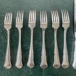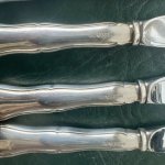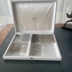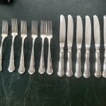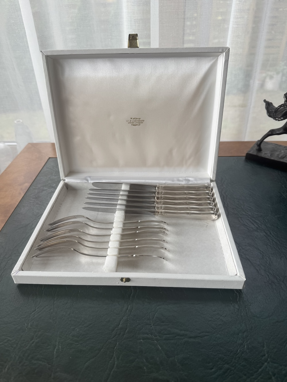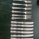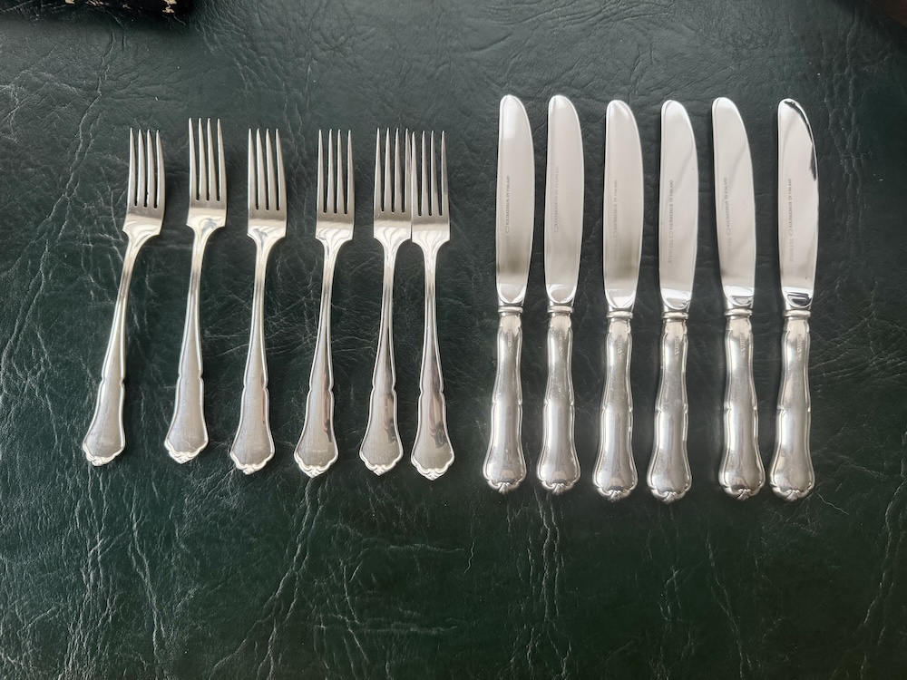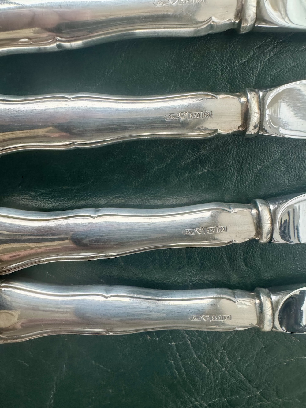Pilns sudraba galda piederumu komplekts 6 personām: dakšiņas, karotes un naži. Ražots Somijā. Garums: 19-16,5 cm. Kopējais svars: 683 grami. Visām detaļām ir proves zīmes. Labā stāvoklī. Nerūsējošā tērauda asmeņi, sudraba rokturi.