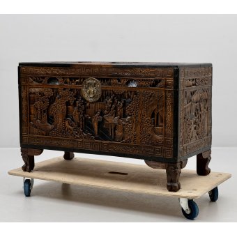 Antīks chinoiserie šūšanas galds ar antīku roku apgleznojumu, bronzas apdari, formas sakrustotām kājām, veramu vāku, 19.gs. beigas. Augstums 74 cm, galda izmērs 60 x 35 cm.