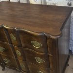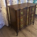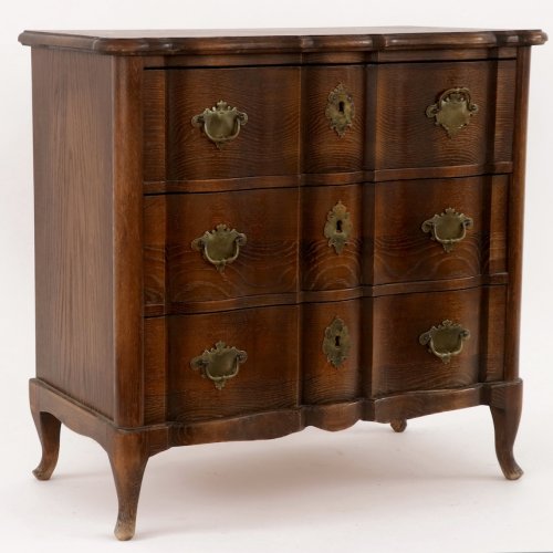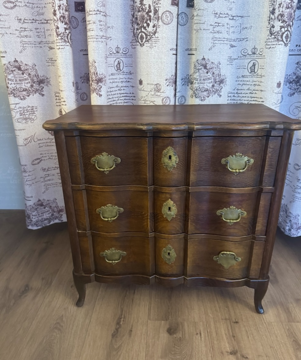 Eleganta antīka ozolkoka kumode ar 3 atvilktnēm, 20. gadsimta sākums. Izliektas kājas, misiņa furnitūra un sarežģīta forma. Augstums 66 cm, platums 68 cm, dziļums 34 cm. Labā stāvoklī.