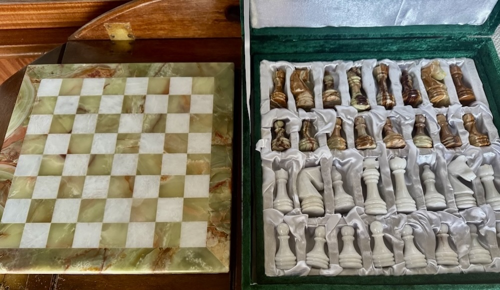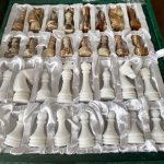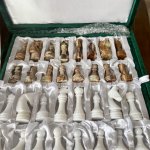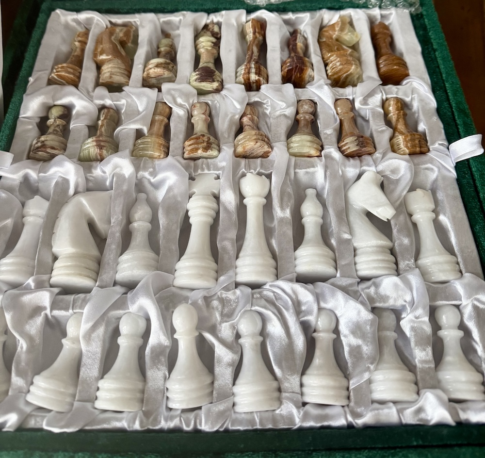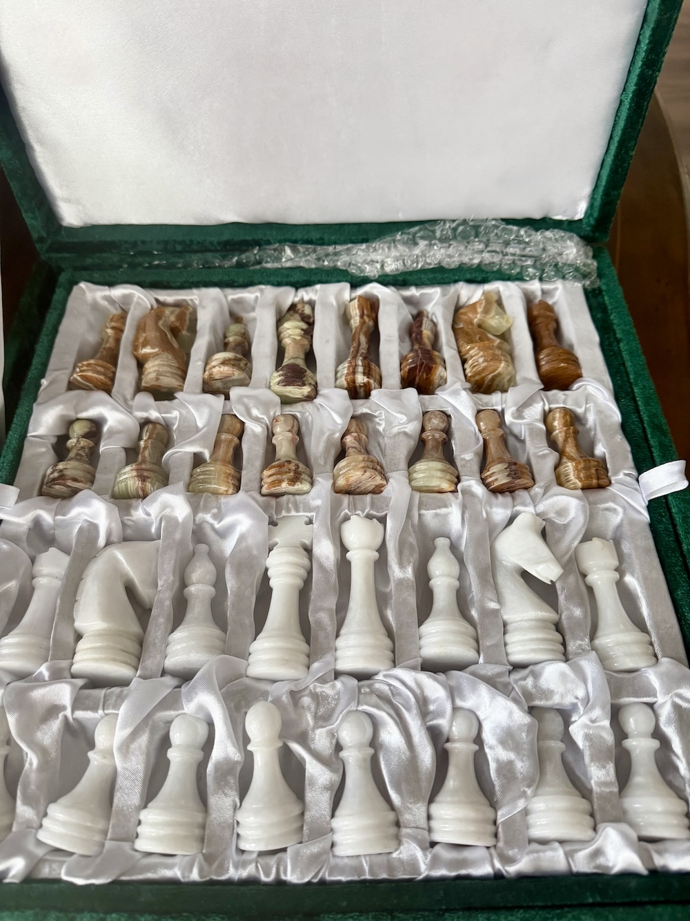 Уникальный Набор шахмат из зеленого и белого оникса с коробкой для хранения, мраморной шахматной доской и невероятными игровыми фигурами в полном комплекте. Прекрасно подходит для подарка, украсит интерьер. Каждый комплект шахматных фигур из оникса неповторим