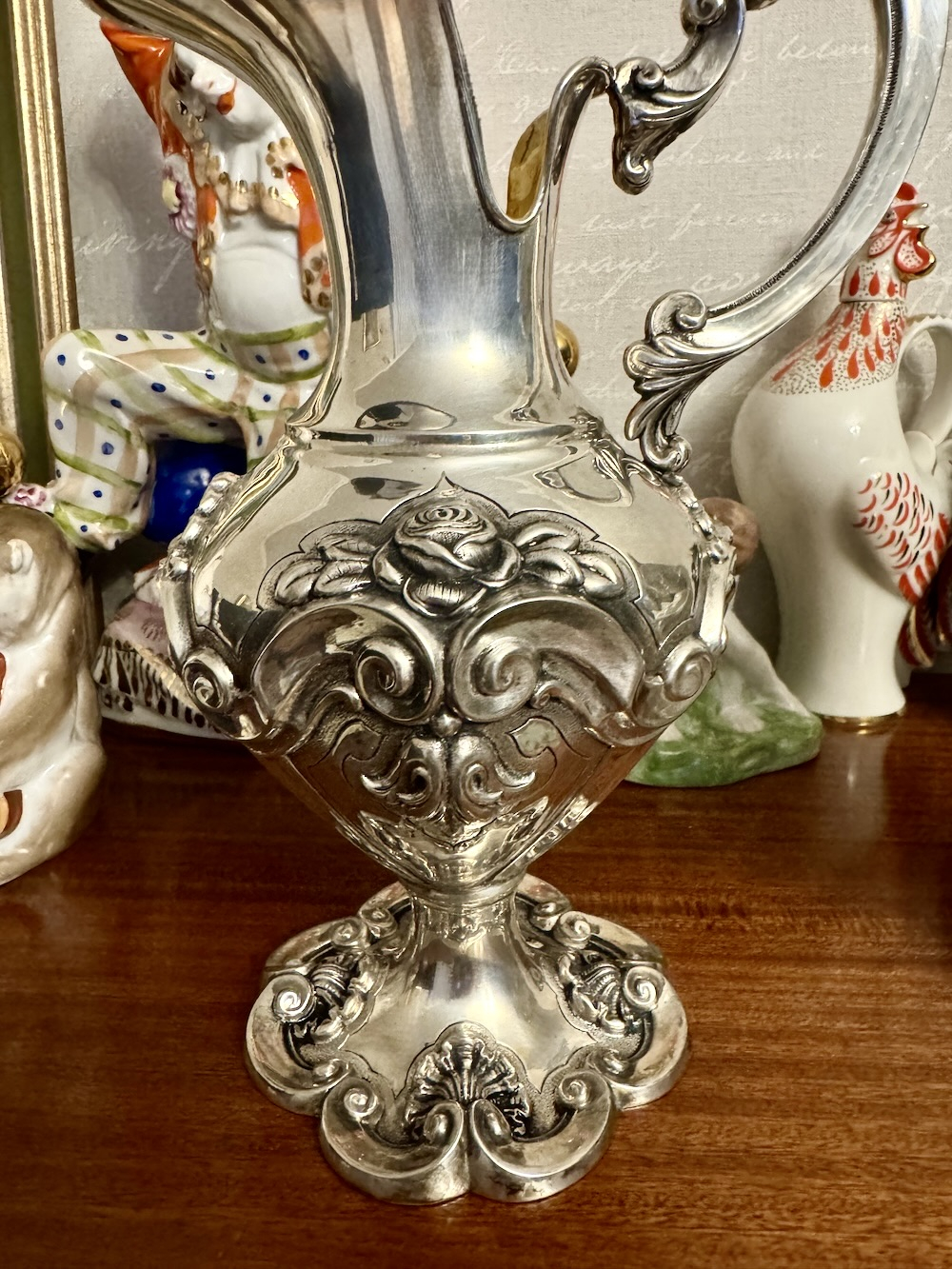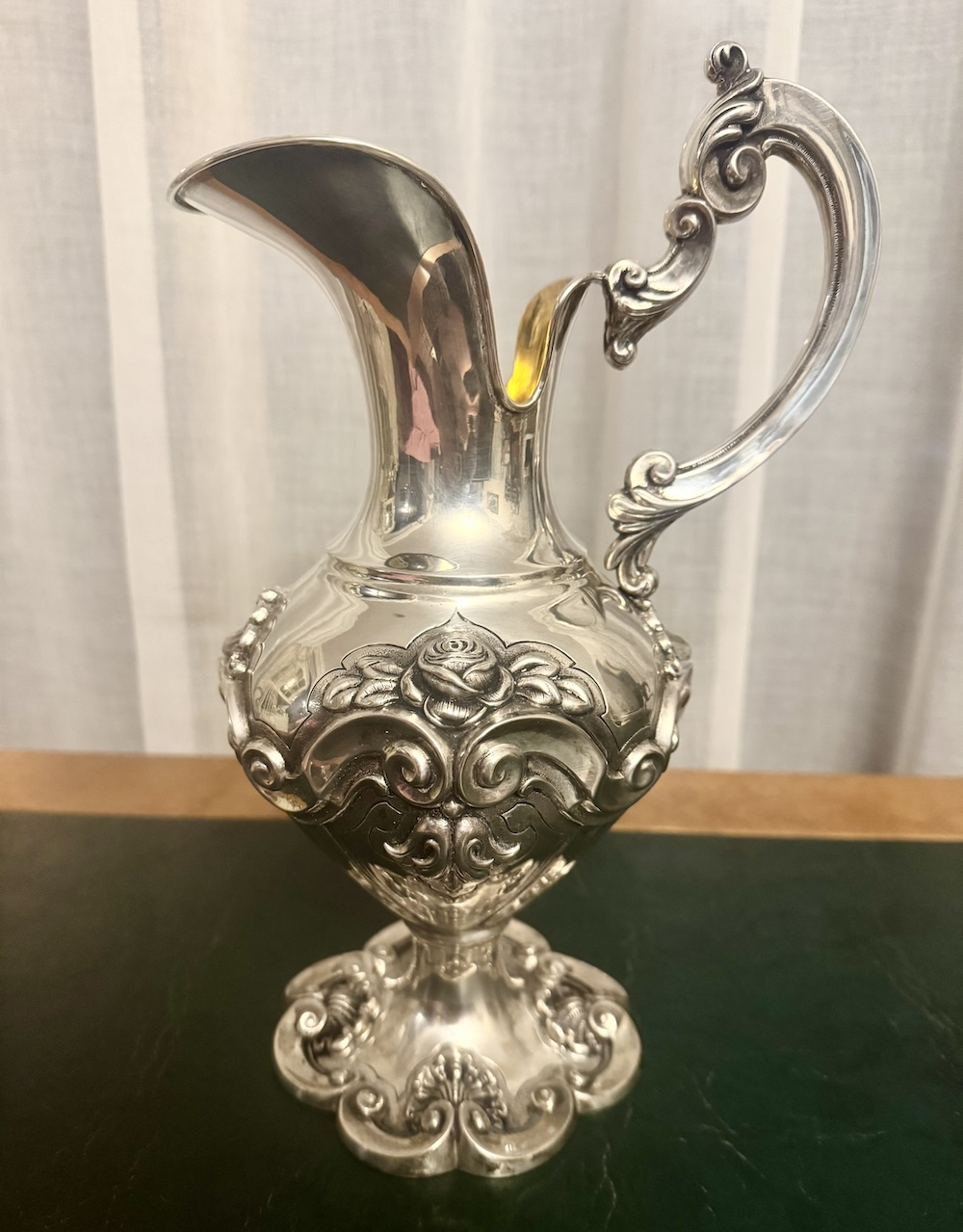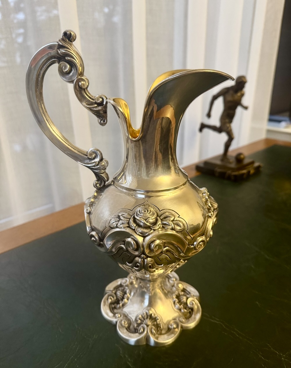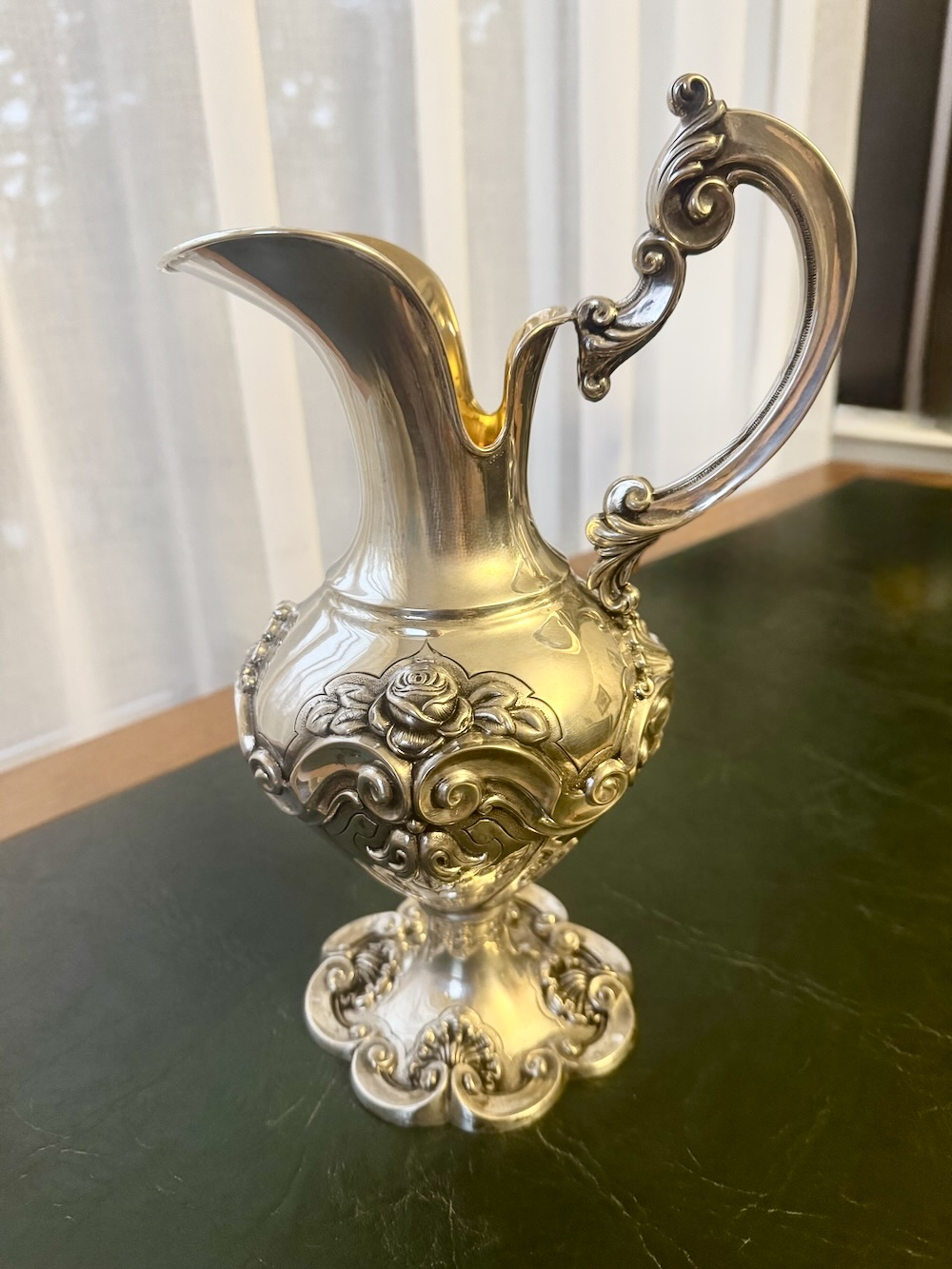Lieliska, gara un smaga sudraba ūdens krūze ar 830. proves zelta pārklājumu, 30 cm augsta un 654 gramus smaga. Tā ir izsmalcināti dekorēta renesanses stilā, ar Zviedrijas importa zīmi, sudraba zīmi un 830. proves zīmi. Tā datēta ar 20. gadsimta pirmo pusi. Lieliskā stāvoklī. Tā neapšaubāmi rotās jebkuru svētku galdu, būs kolekcionāra dārgums un brīnišķīga dāvana.