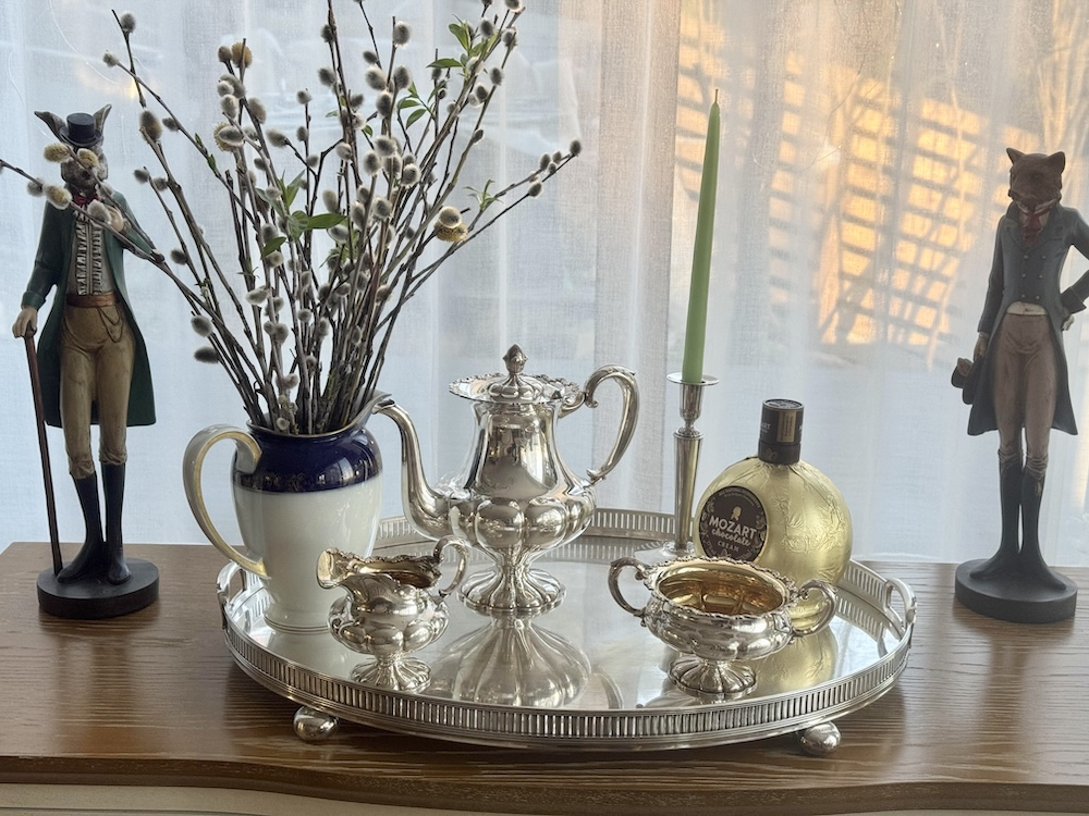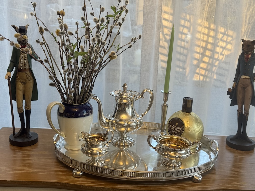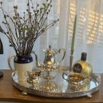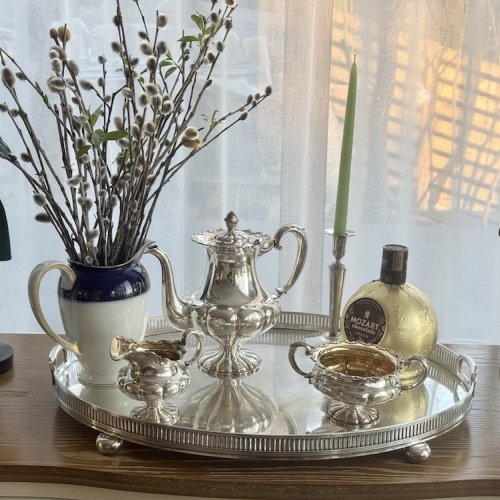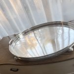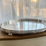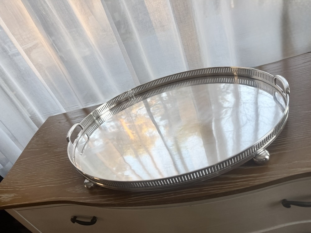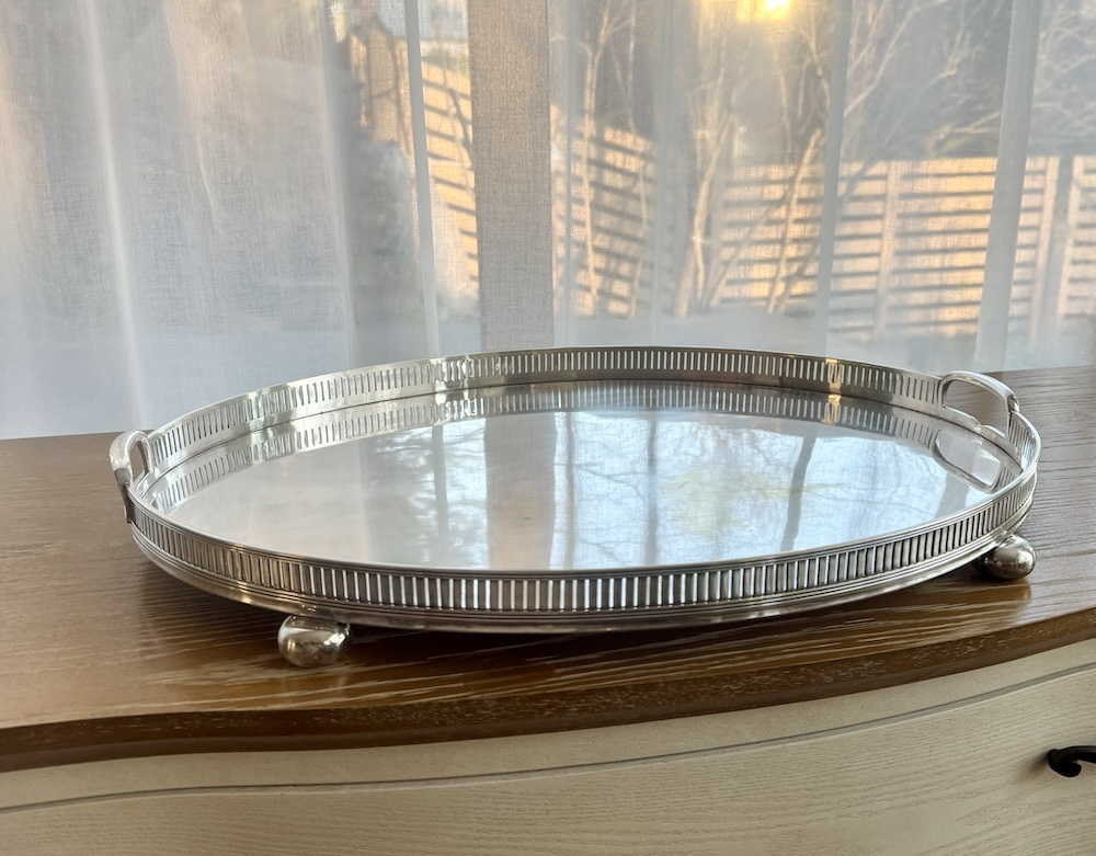 Sudrabots servēšanas paplāte ar apaļām kājām vakariņām vai elegantam galda klājumam. Šī paplāte būs svinīgas pieņemšanas centrālais elements, centrālais elements vai skaists dekoratīvs elements. Garums 57 cm, platums 44 cm, CGH proves zīme 1933. gadā.
