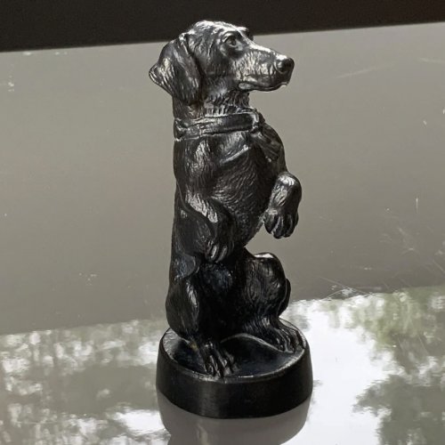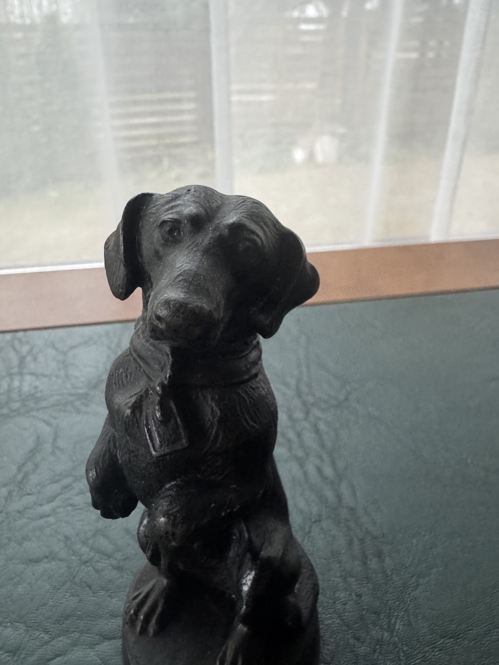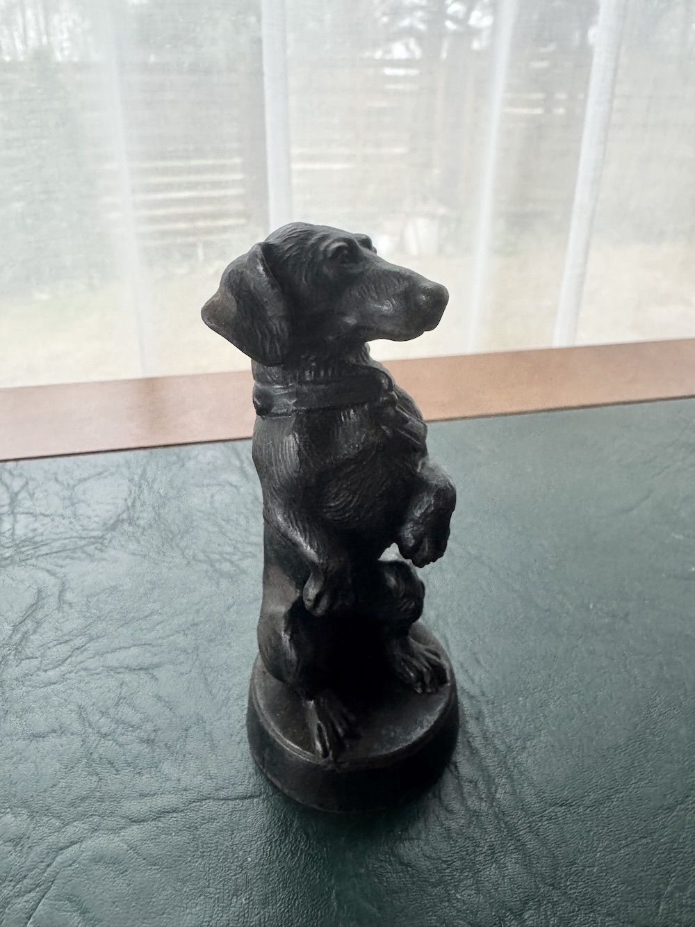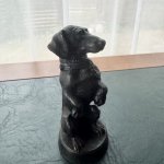 Čuguna figūriņa ar suni Družoku (taksītis, kas stāv uz pakaļkājām), izgatavota slavenajā Kasli dzelzs lietuvē (Kasli). Čuguns. PSRS. 1989. Augstums 11,5 cm, labā stāvoklī, rets eksemplārs.
