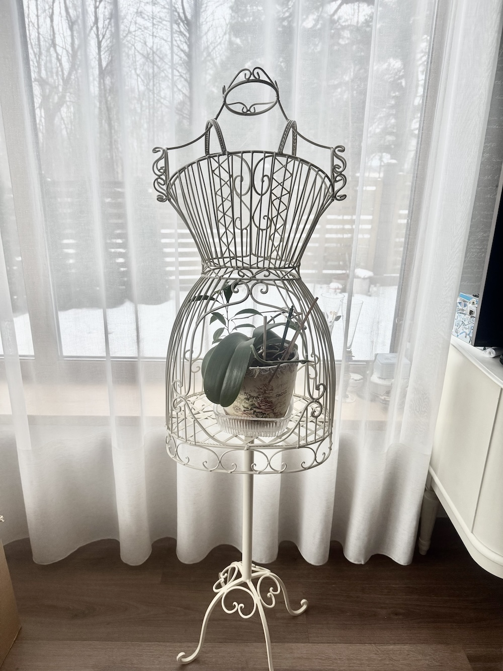Конструкция манекена выполнена из тонких белых металлических прутьев и установлена на ножке , Длина 39 см, ширина 30 см, высота 140 см.