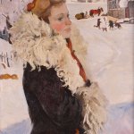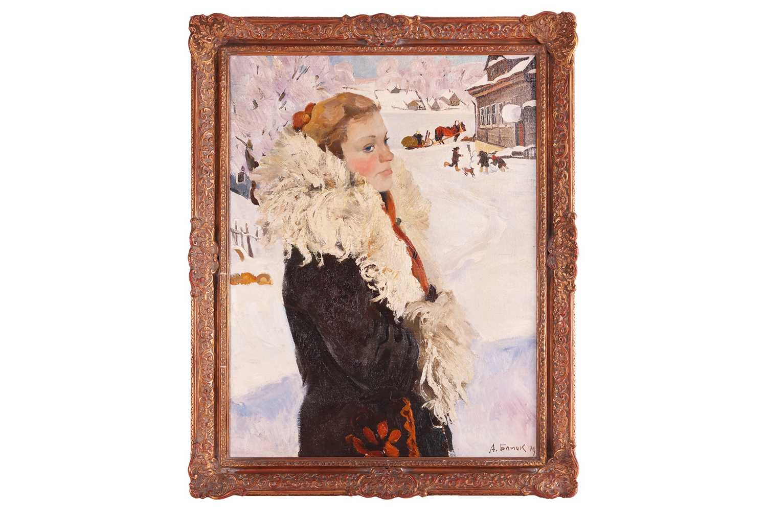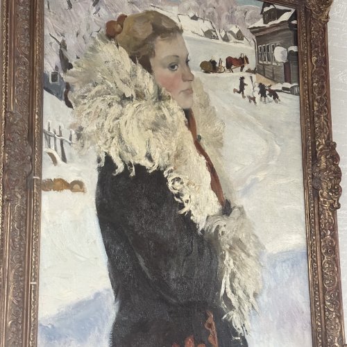 Карина "На старой Ладоге" Андрей Блиок (русский, род. 1946). Портрет дамы в меховой шубе в зимнем пейзаже необыкновенно реалистичен и точно передает морозное русское утро . Подписан автором и датирован '79 (внизу справа), надпись кириллицей на обороте. Масло на холсте, 75 x 57 см, в раме 87,5 x 70 см.