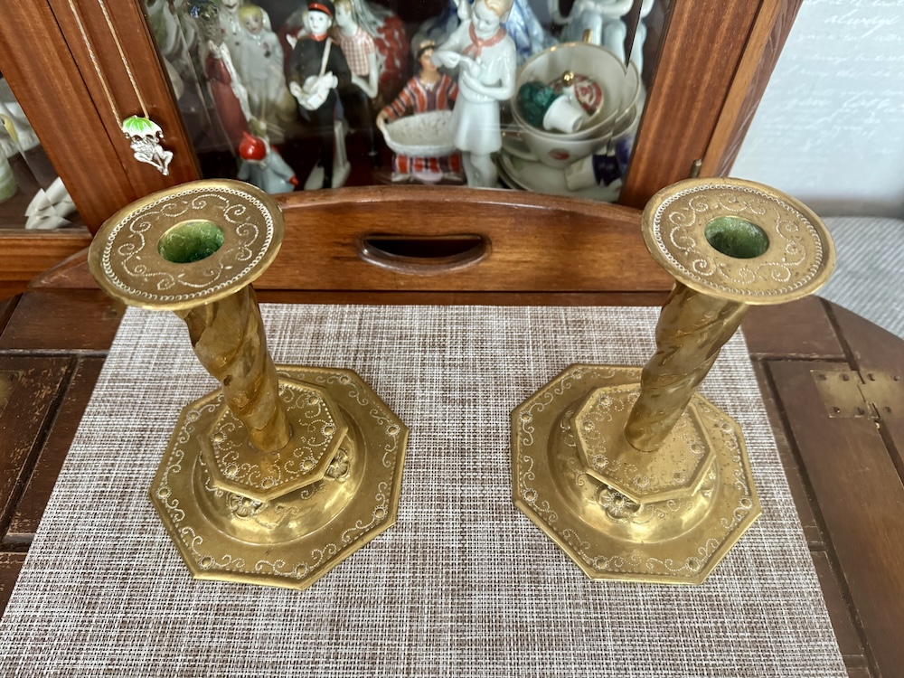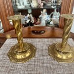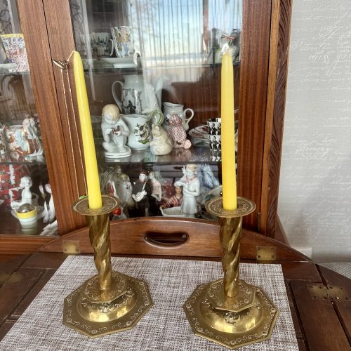 Пара антикварных подсвечников из латуни , восьмиугольной формы, с рельефным изображением фруктов на куполообразном основании под спиральными колоннами (высота 25 см). На основании клеймо башни и буквы МК. Хорошее состояние. Цена за пару