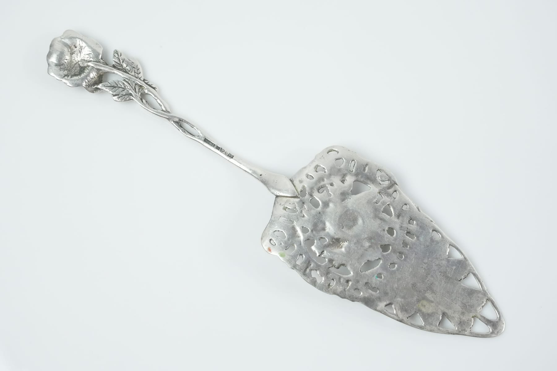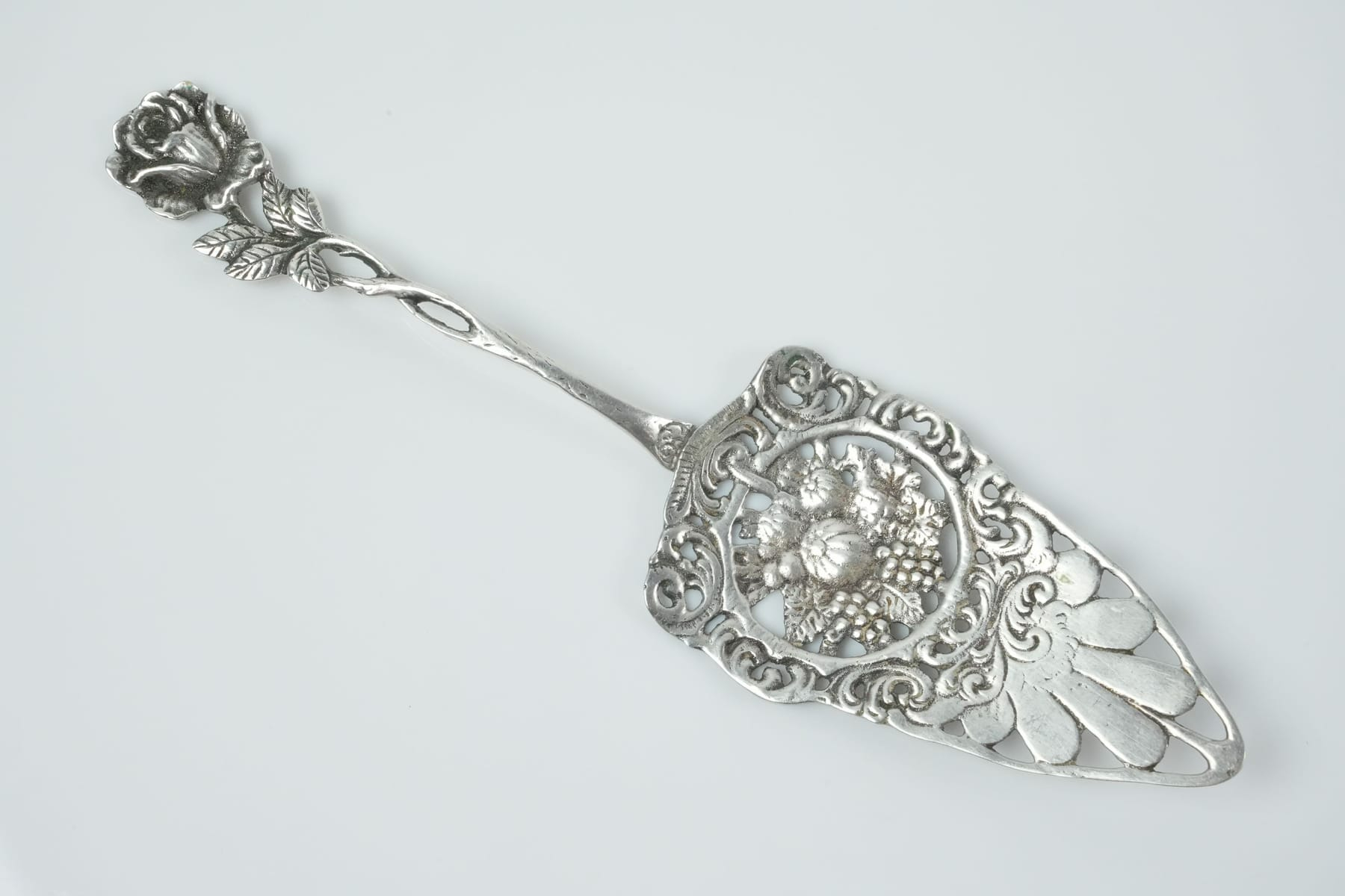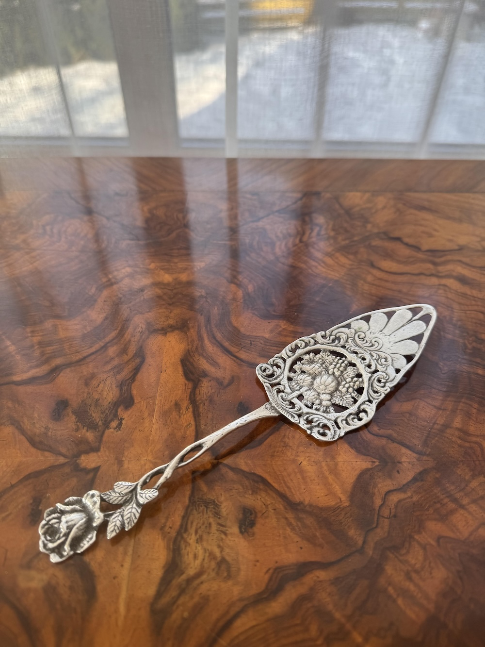 Старинная серебряная лопаточка для торта , Gewe, Швеция, 1947, серебро 830 пробы, клеймо, около 45,54 г. Красивый ажурный декор, увенчанный хильдесхаймской розой , символом неумирающей жизненной силы