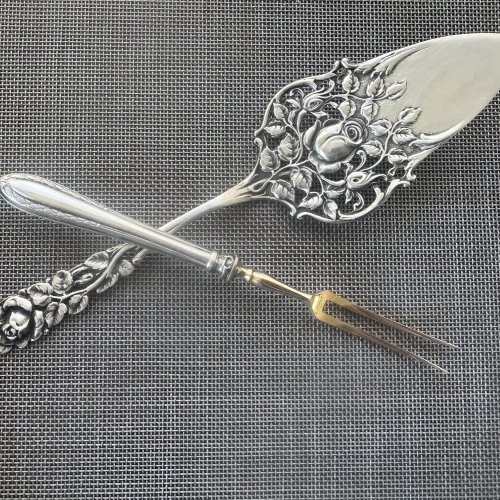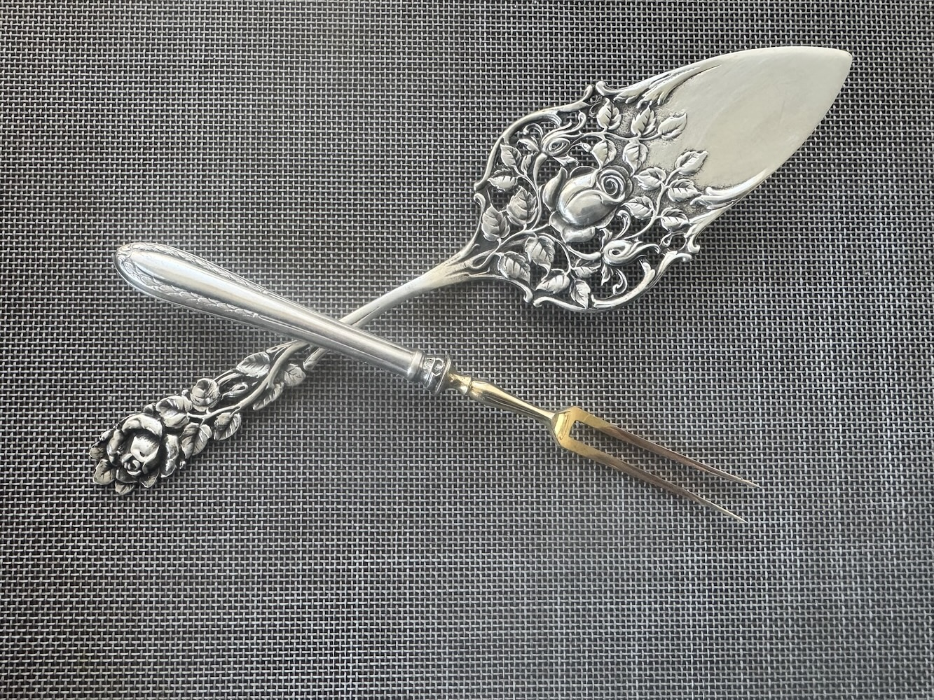 Прекрасный набор для чаепития - старинная серебряная лопаточка для торта , серебро 830 пробы, Швеция, 1955 год , клеймо, вес около 55 г, длина . Красивый ажурный декор, увенчанный хильдесхаймской розой , символом неумирающей жизненной силы