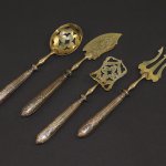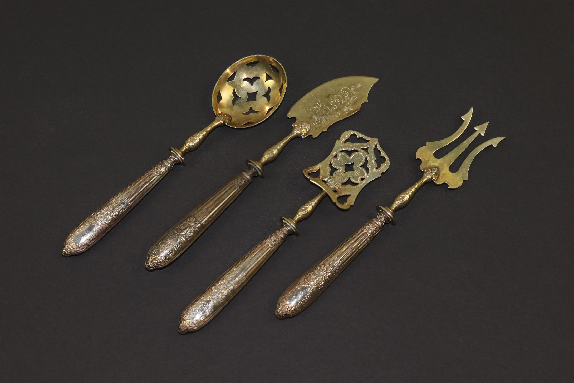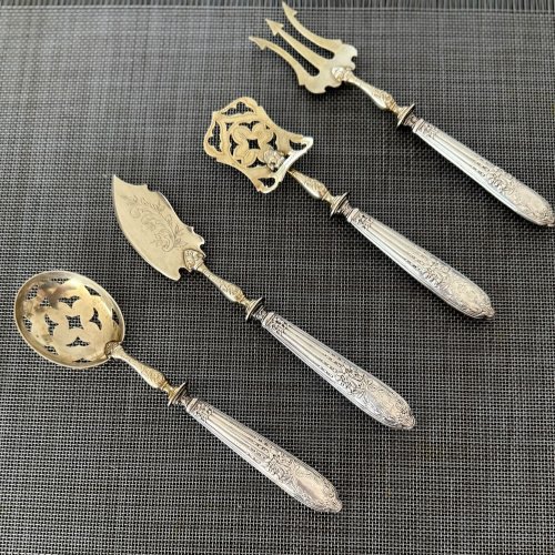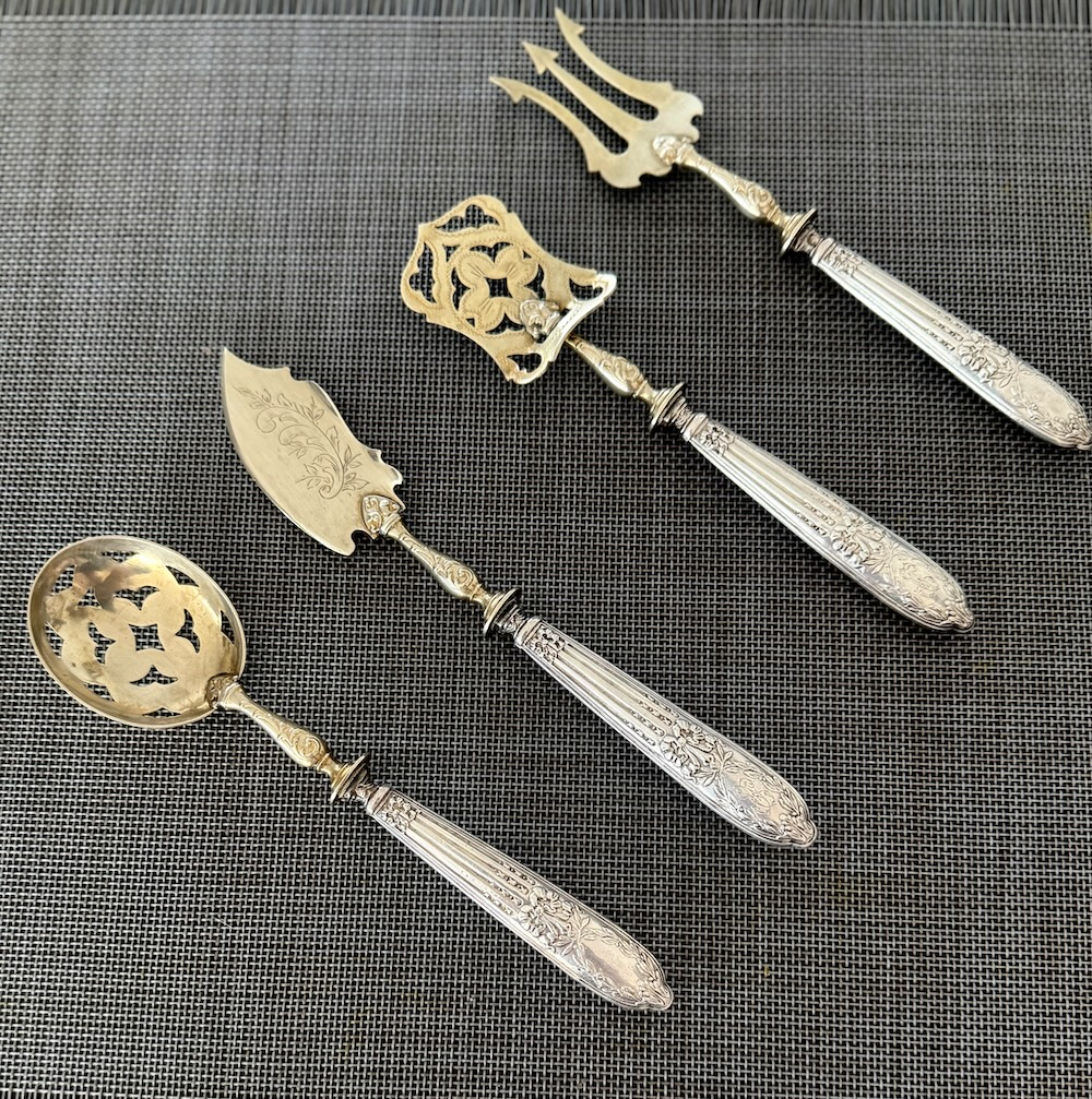 Великолепный набор для сервировки стола с ручками из серебра, золочение, Франция , на каждом предмете французское клеймо серебра Минерва 2, начало 1900-х.