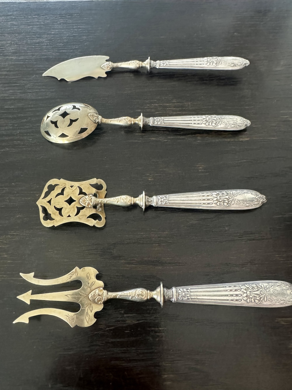 В наборе: вилка для шпрот или сардин, нож для масла, паштета, лопаточка для сыра или фуа гра, а также ложка для оливок. Это красивый экземпляр представляет собой подлинную французскую старину для изысканной сервировки стола.