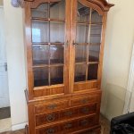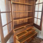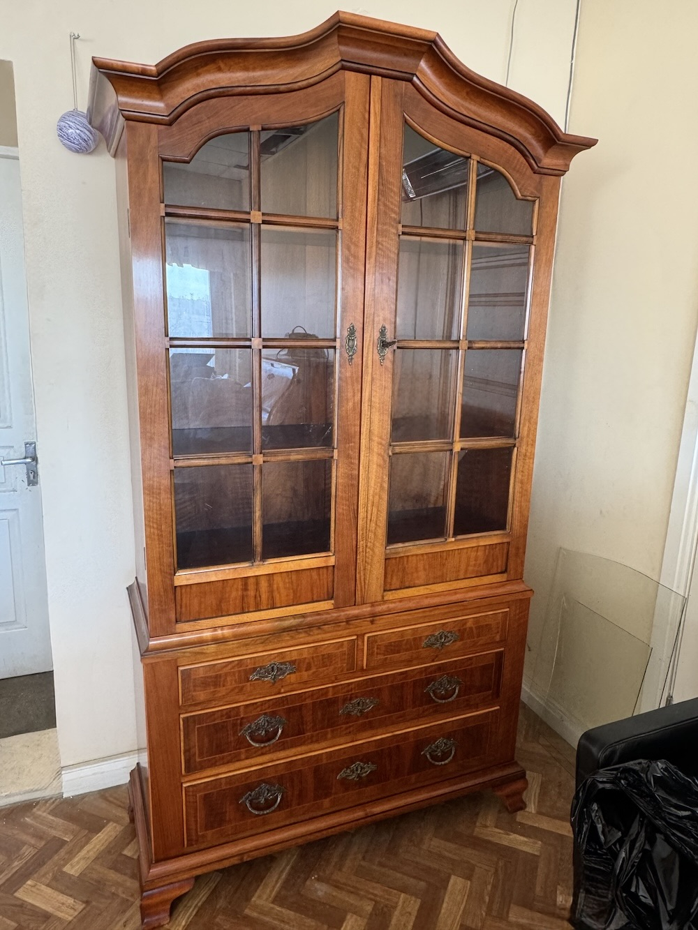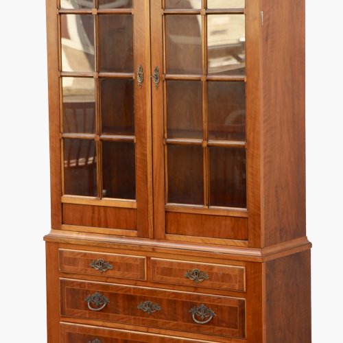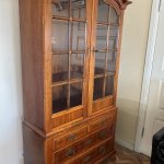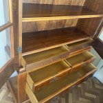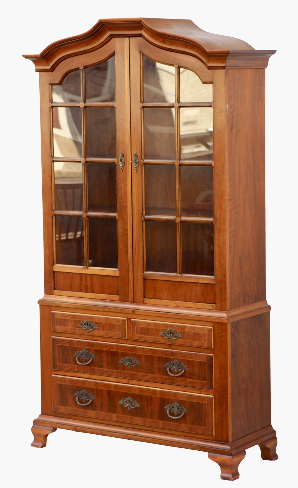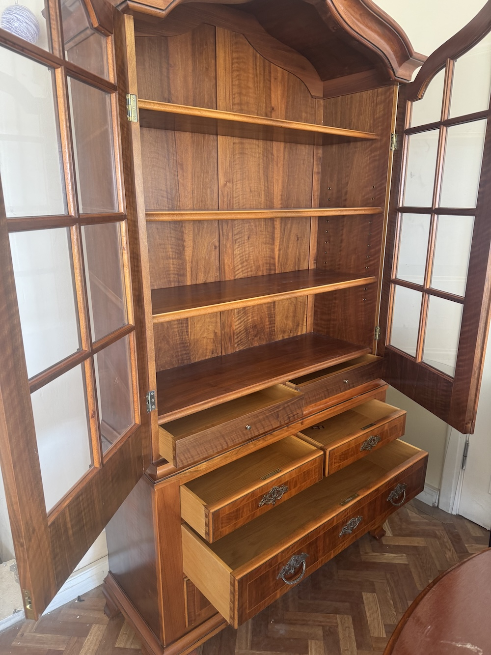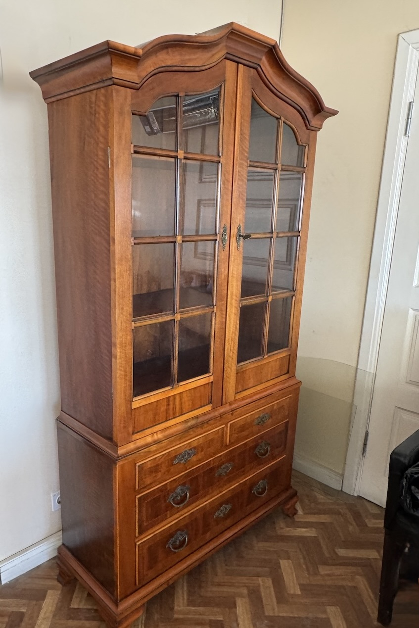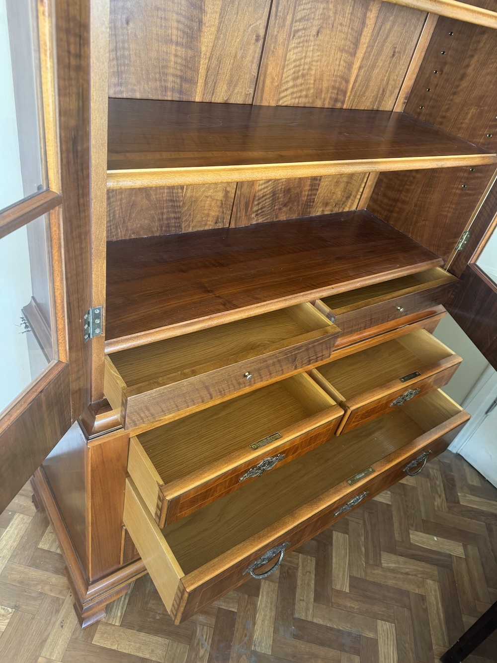 Книжный шкаф -витрина в английском стиле, увенчанный короной , отделка шпоном. Двойные стеклянные дверцы, четыре выдвижных ящика+2 внутренних. Внутри три полки. Ключ в комплекте. Высота 193 см, ширина 106 см, глубина 41 см.