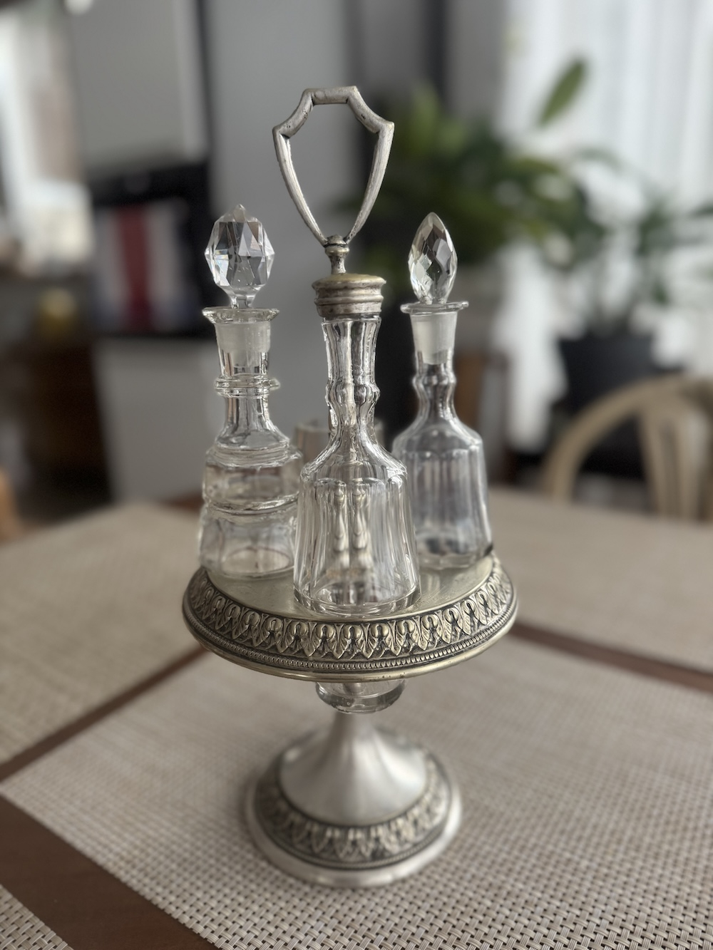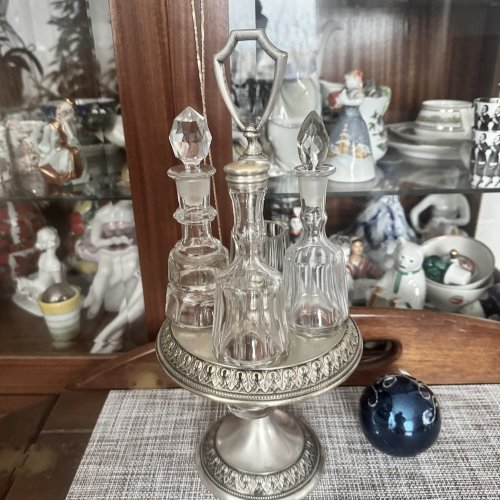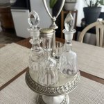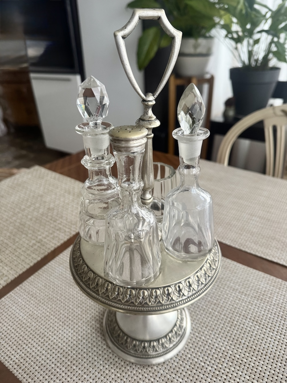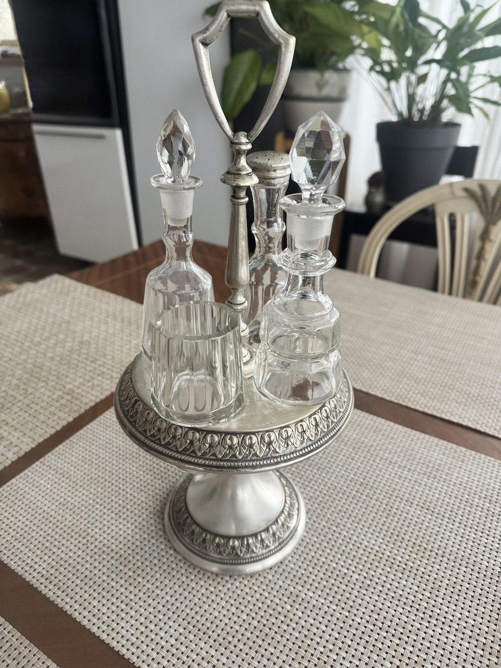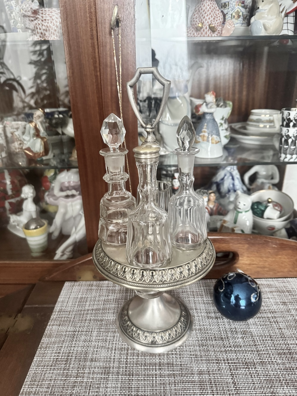 Старинный круэт для четырех емкостей для масла и др приправ. Клеймо мельхиора и старейшей шведской компании GAB . GAB — это шведский производитель высококачественных столовых приборов и посуды из серебра и посеребренной стали уже более 150 лет, является обладателем Королевского ордера