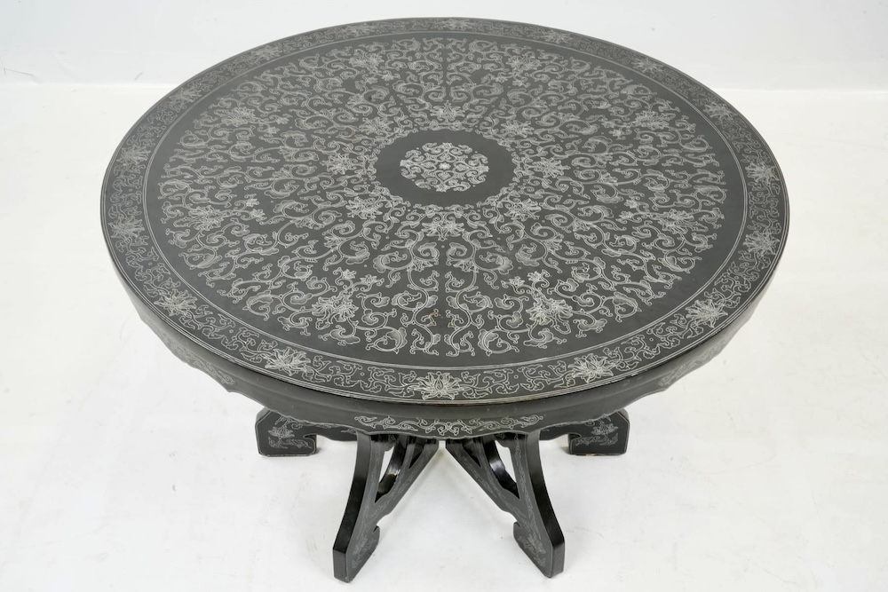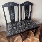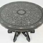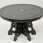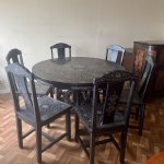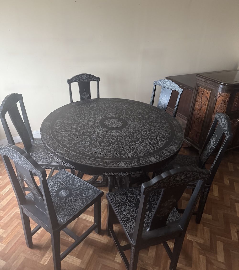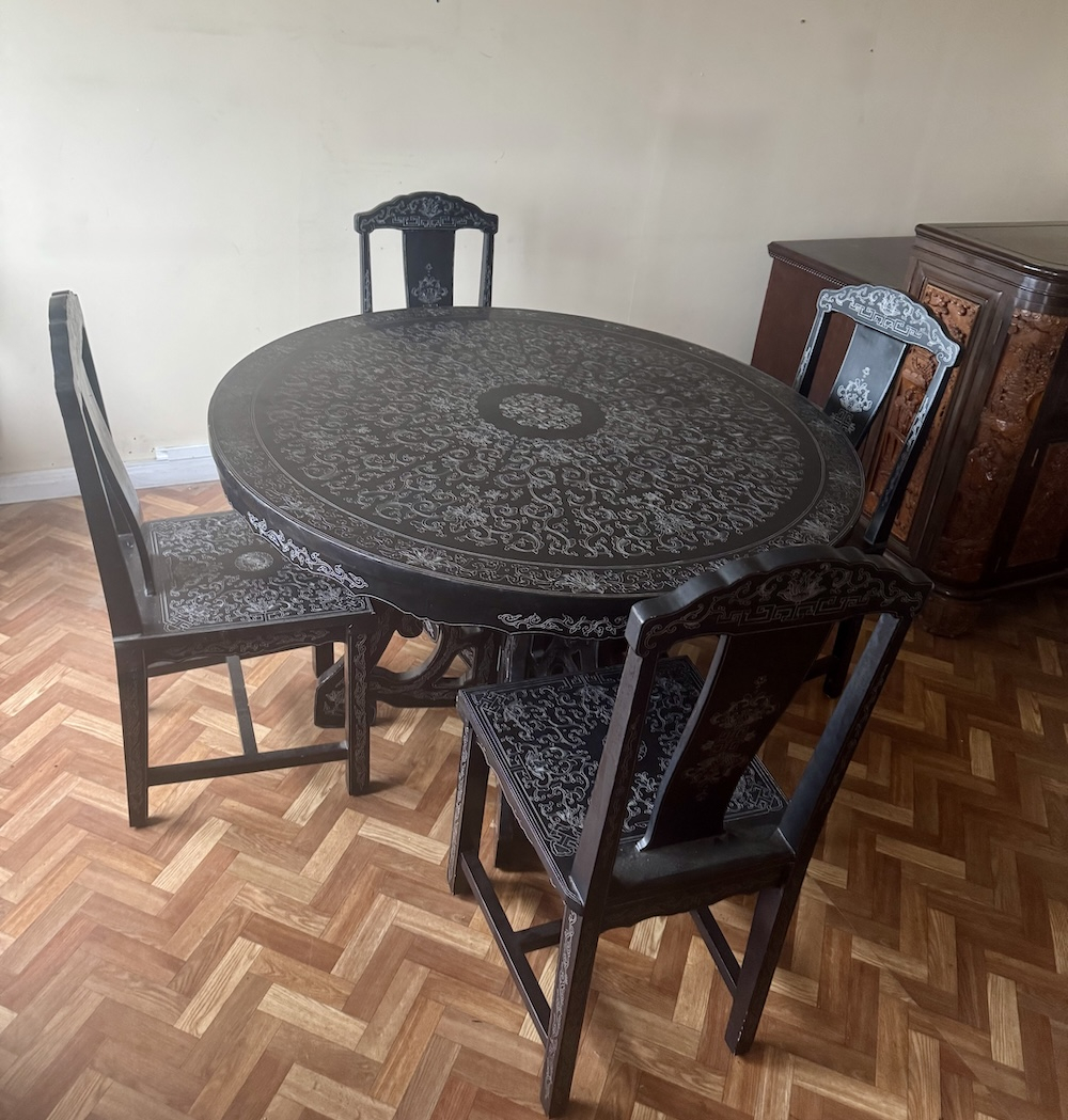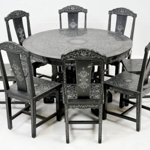 Уникальный лакированный обеденный стол со стульями с замысловатым серебряным узором в китайским стиле Шинуазри 1950 годов с этикеткой Jinlong (Золотой Дракон) . Высота стола 78 см, ширина 125 см. Стол состоит из двух частей: круглой поверхности и опоры. Можно приобрести в комплекте стол и 4 стула, стол и 6 стульев или стол и 8 стульев. Цена указана за комплект из стола и 4 стульев.