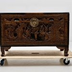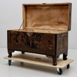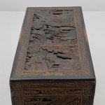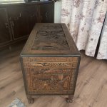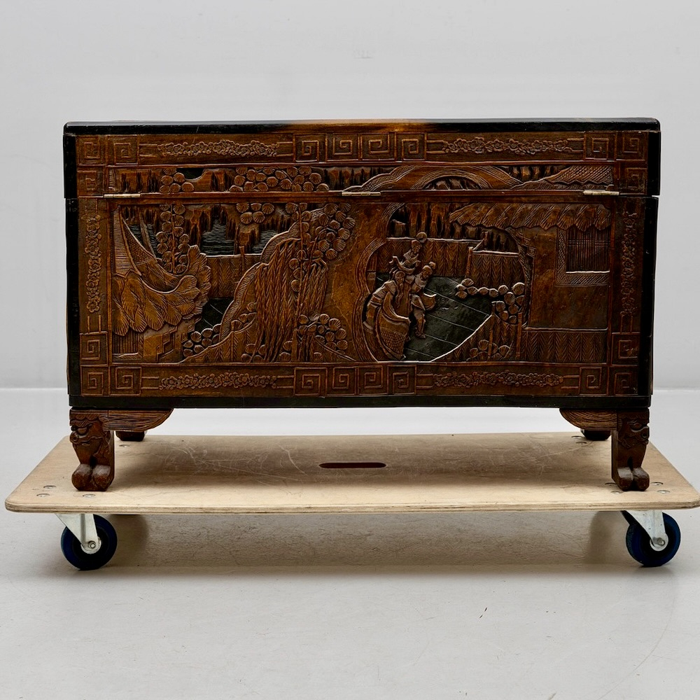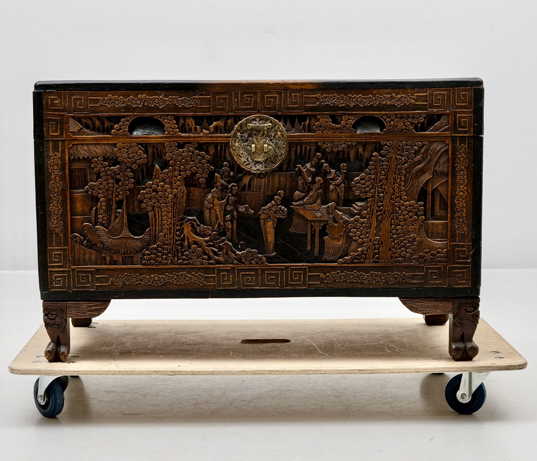 Антикварный китайский резной деревянный сундук из камфорного дерева, начало XX века., полностью ручная работа, массив, резная отделка с изображением садовых сцен, цветочных гирлянд и бордюра. Изготовленный из камфорного дерева, известного своей прочностью и устойчивостью к вредителям, он не только отличается потрясающим мастерством, но и сохраняет свои природные ароматические свойства. Детальная резьба с традиционными китайскими мотивами несомненно добавит изысканность и оригинальность в интерьер