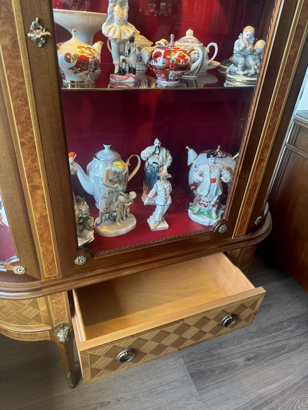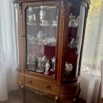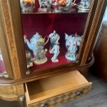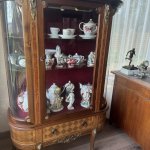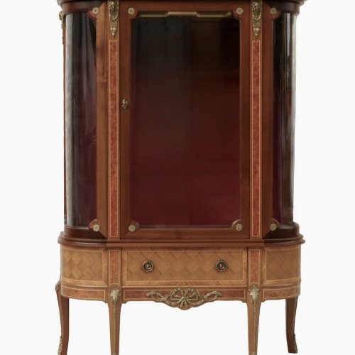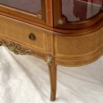 Великолепная элегантная витрина в стиле Людовика XVI, декор маркетри с красивым рисунком, ценные породы древесины, латунные накладки, сложная закругленная форма, вместительная, панорамное остекление . Одна дверца, ключ, внутри две полки, вместительный ящик, подсветка. Высота 149 см, ширина 100 см, глубина 39 см.