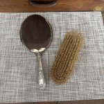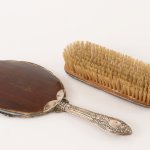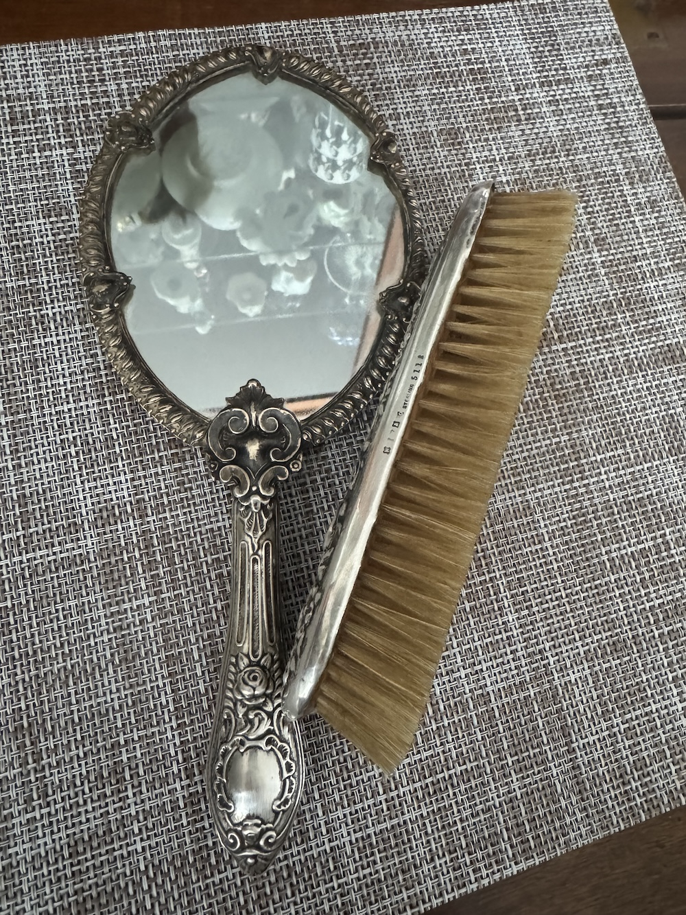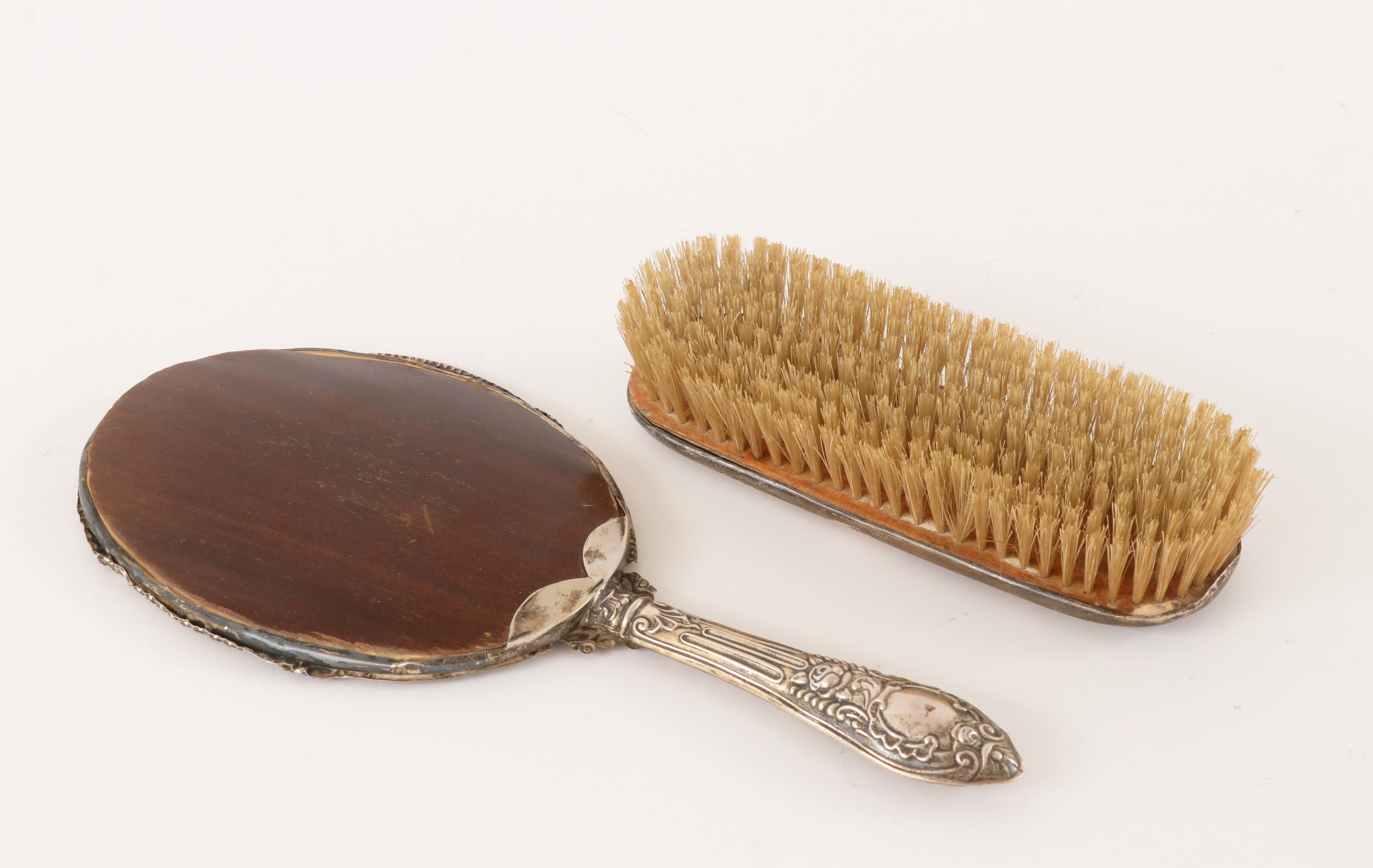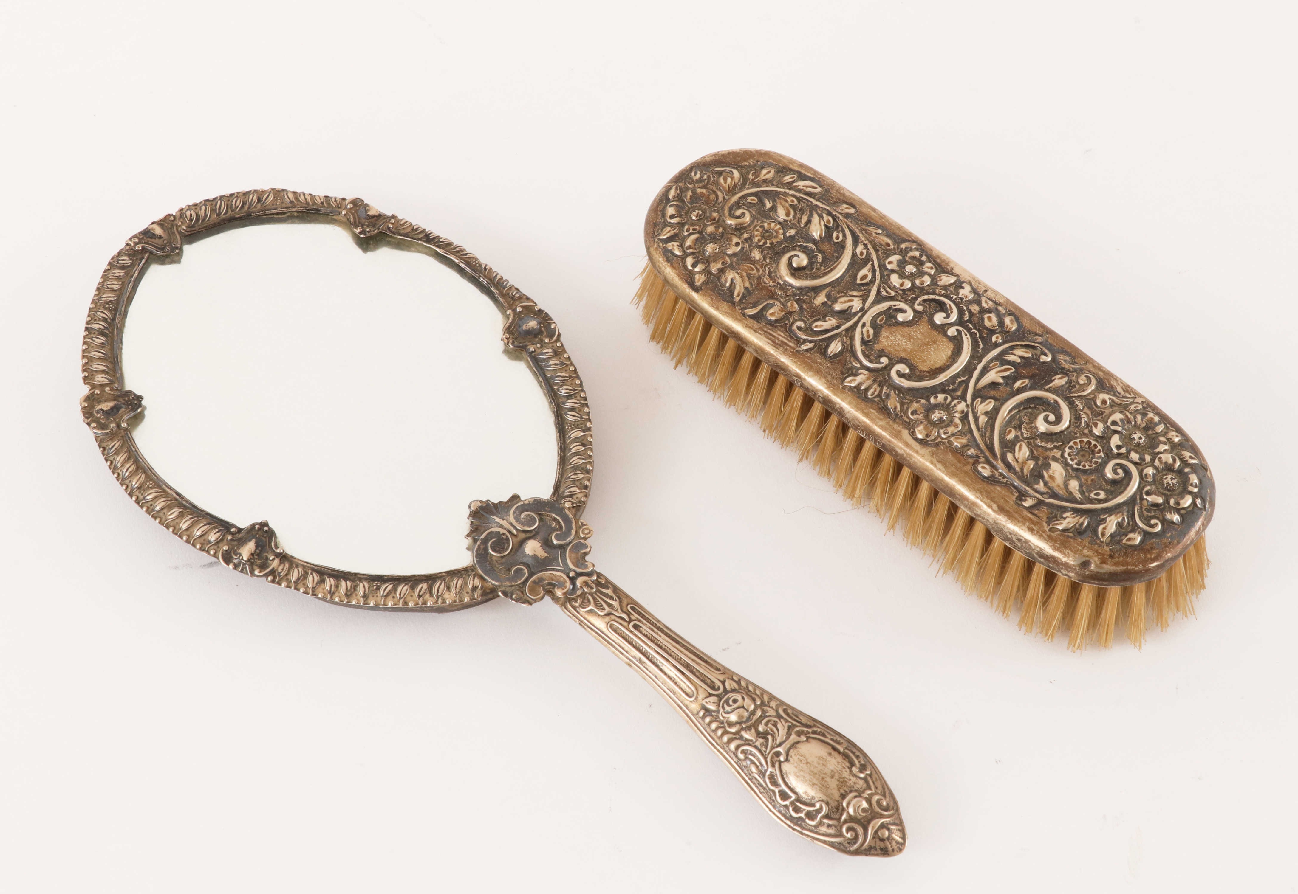 Комплект из антикварных предметов обихода в виде ручного зеркала и щетки, с замысловатым рельефным декором, изготовленный из стерлингового серебра 925 пробы, Англия. Размер : Длина 16,5-26 см Четкое клеймо на щетке Sterling 925/1000