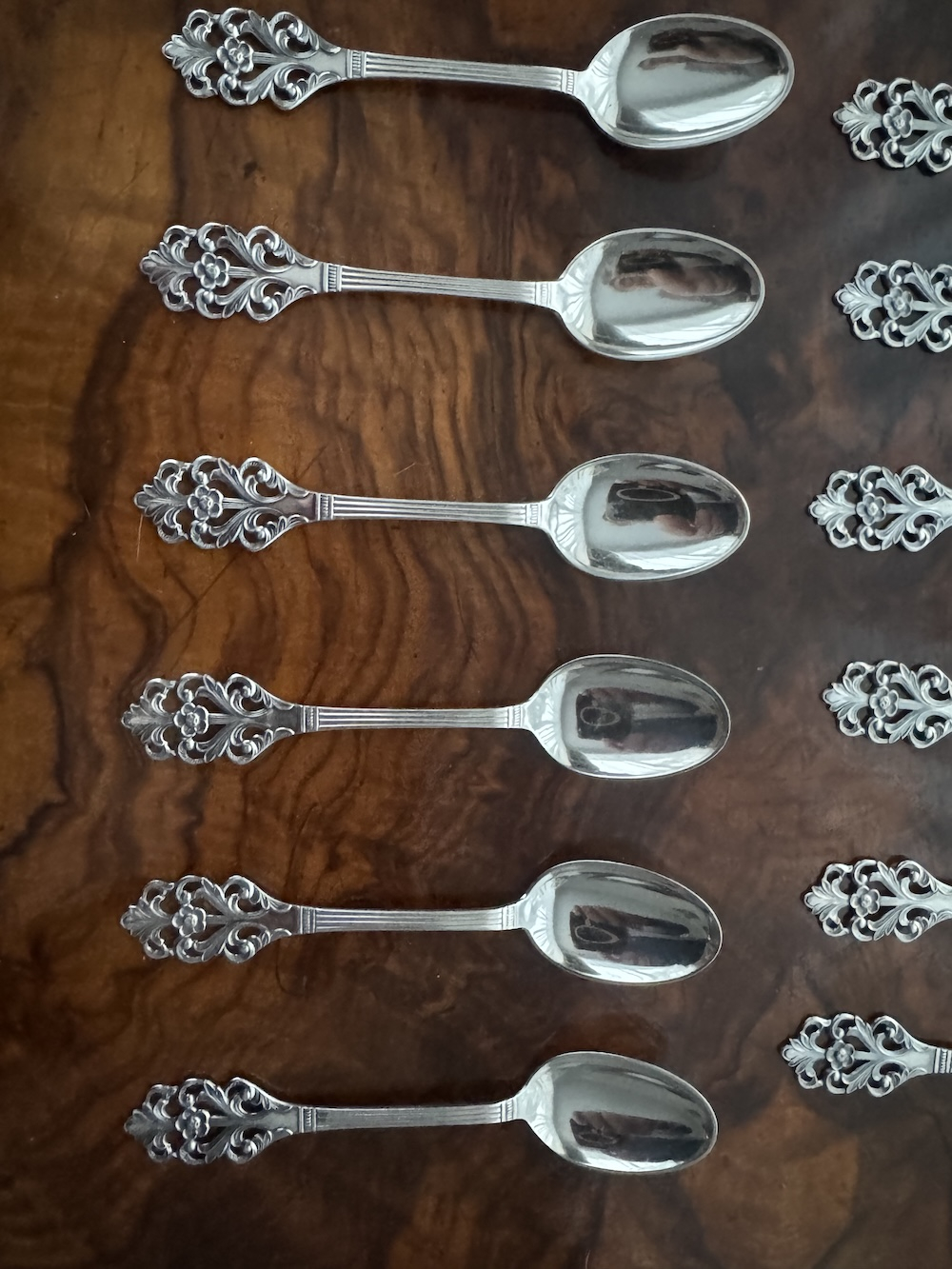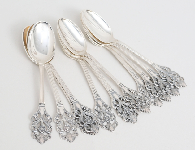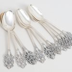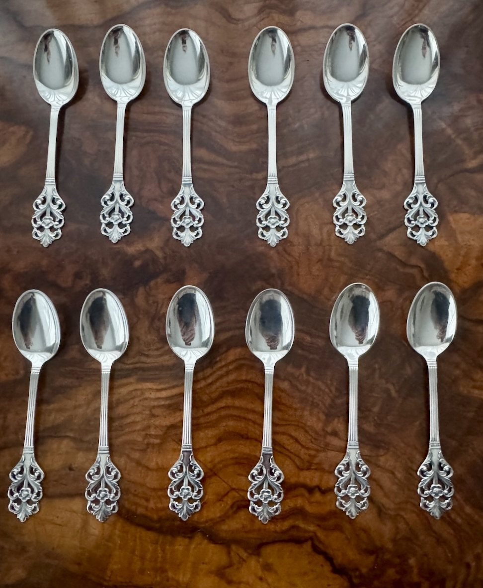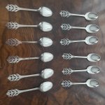 Прекрасный старинный комплект из 12 серебряных кофейных ложечек, красивых и изящных, клеймо Норвегии , 1900-х годов. На каждой ложечке проба серебра 830 S . Длина 11,5 см, вес 114 грамм. Хорошая сохранность. Цена указана за комплект(6 ложечек)