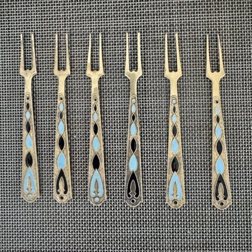 Комплект из 6 серебряных вилочек для для лимона или др. закусок советского периода 875 пробы Ленинградской ювелирно-часовой фабрики, с великолепной эмалью и не стертой позолотой. Вес 33,37 г. Длина = 9,4 см. Большая редкость, хорошее состояние. Четкие клейма 875 пробы со звездой и ЛЮЗ на каждом предмете.