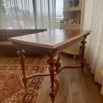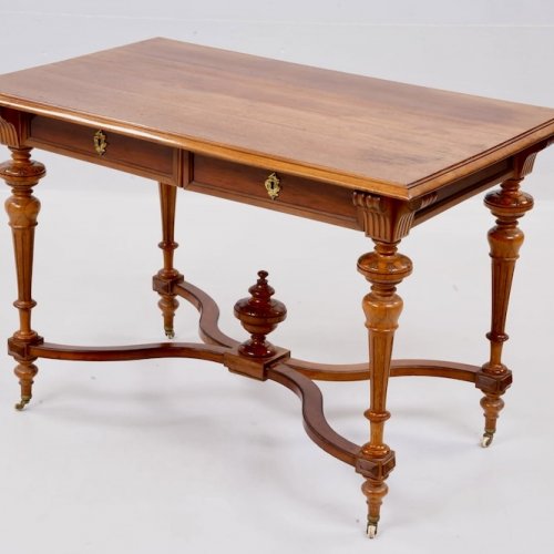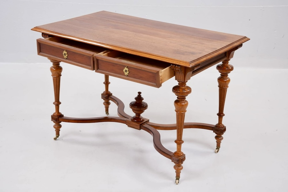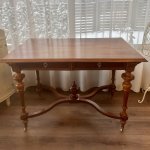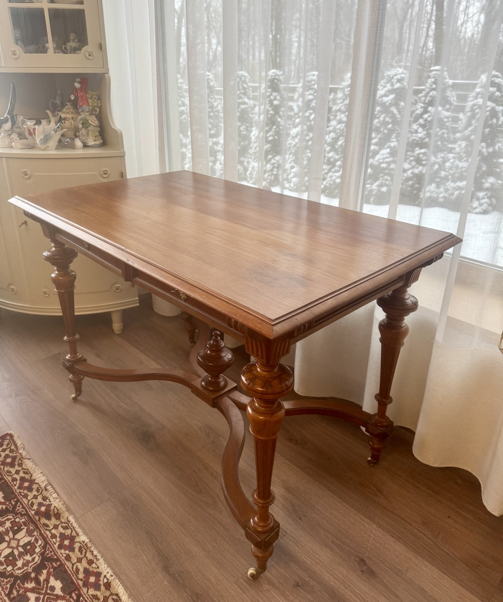 Прекрасный антикварный стол на колесиках с 2 выдвижными ящиками, красное дерево, 1850-1910-х годов, стиль неоренессанс, точеные ножки, ручной работы украшения. Подойдет как письменный стол, как обеденный, как салонный или библиотечный.