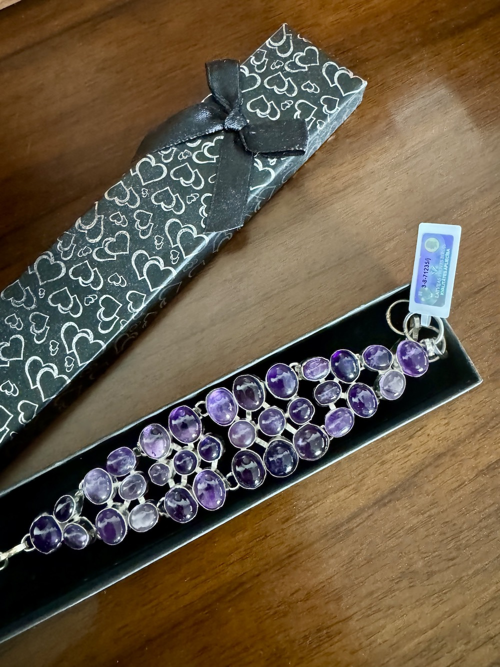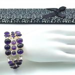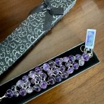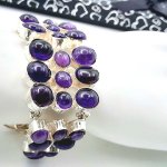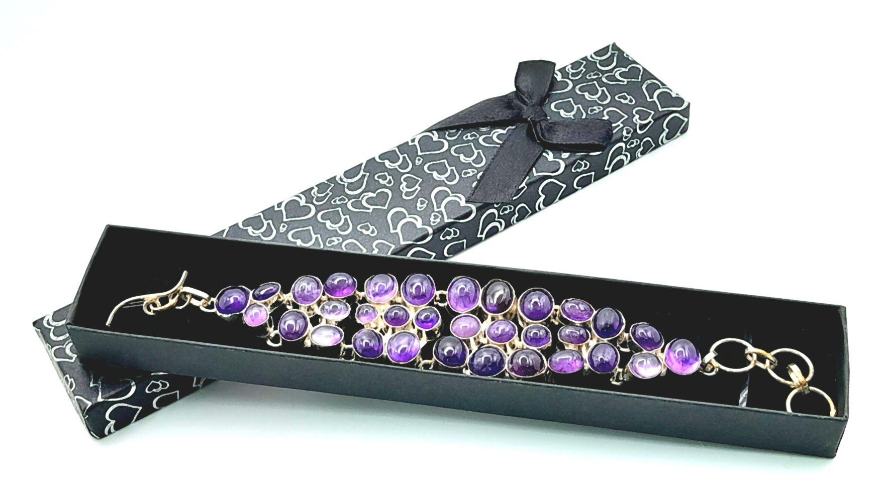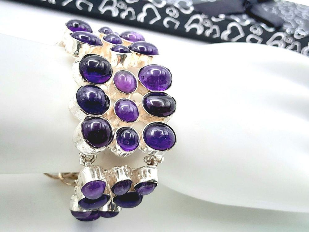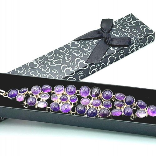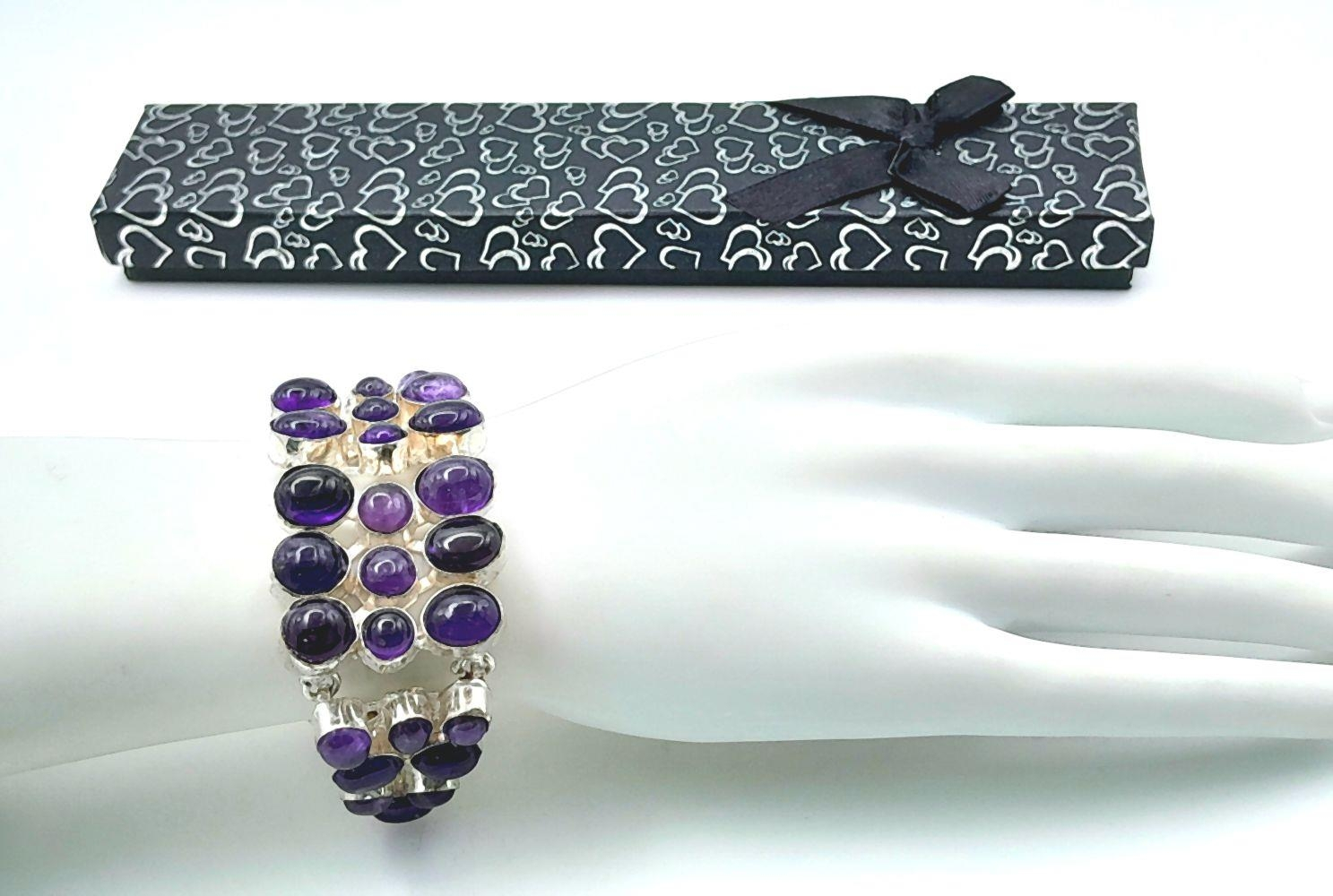 Изысканный английский винтажный браслет с великолепными крупными натуральными аметистовыми кабошонами в подарочном футляре. Серебряная оправа высшей 925 пробы . Длина: 17-22 см, вес: 56,48 г. Аметисты протестированы Латвийской Пробирной палатой, также клеймо серебра 925 пробы .