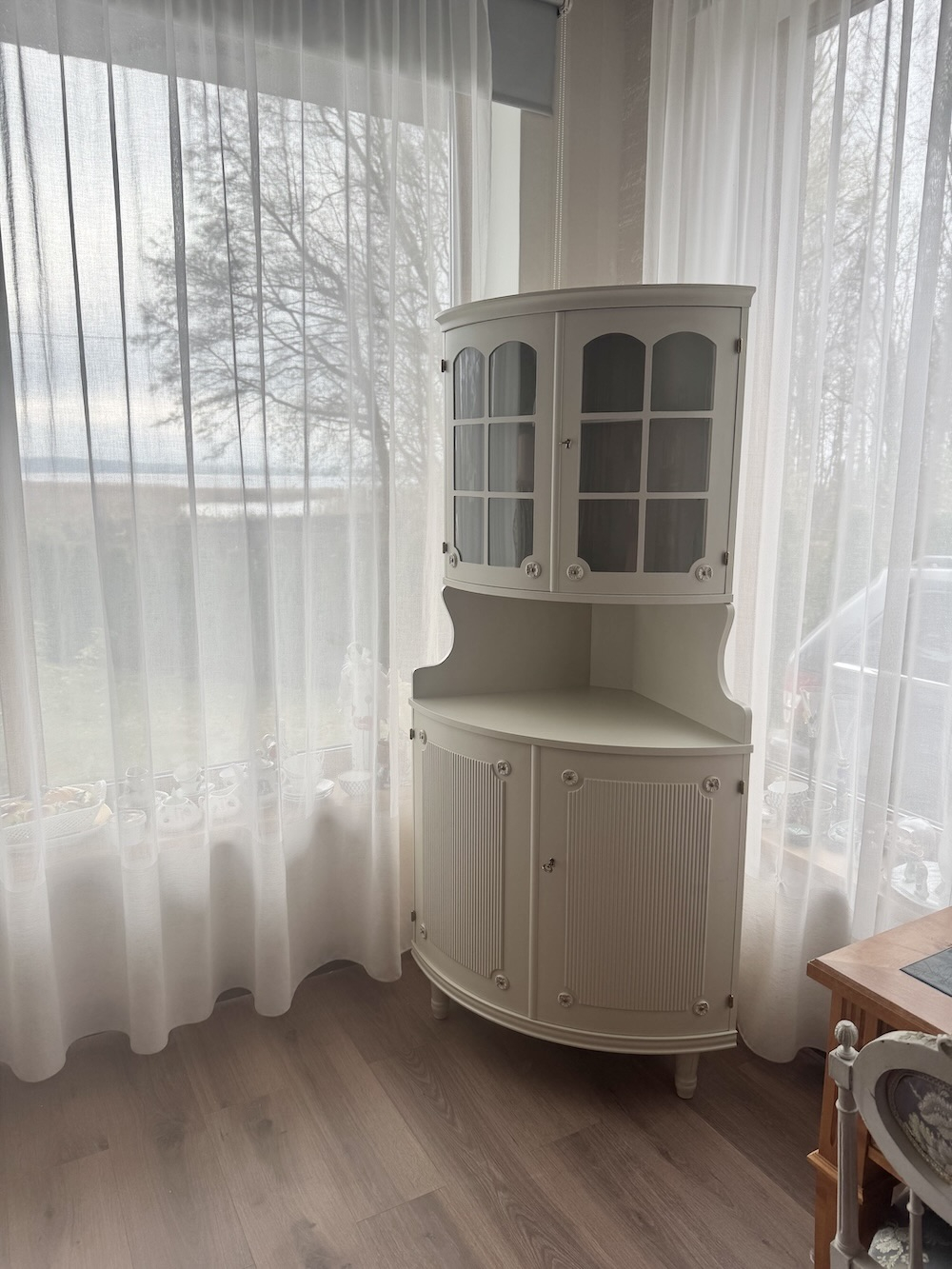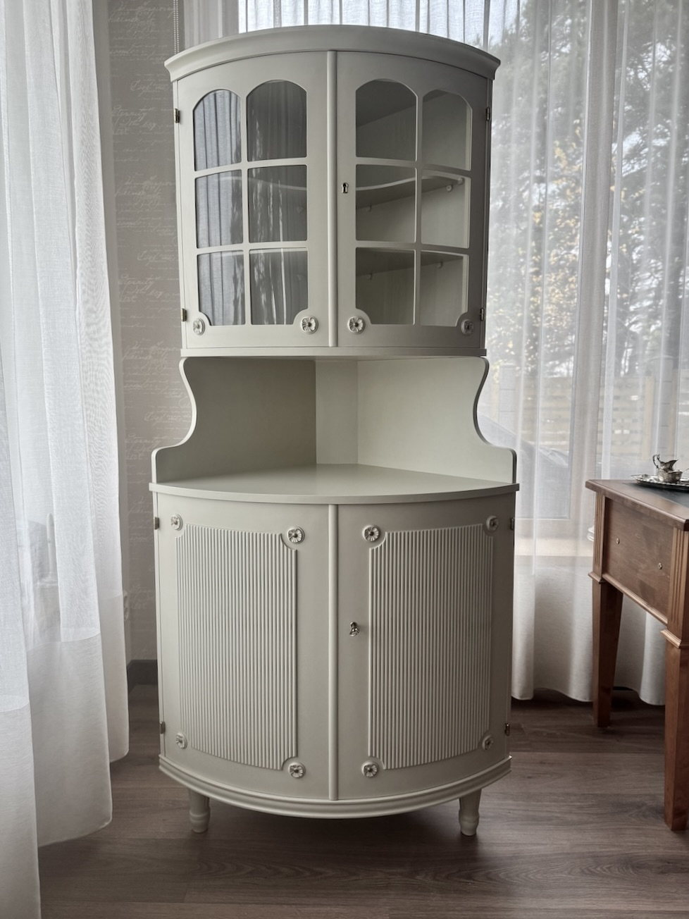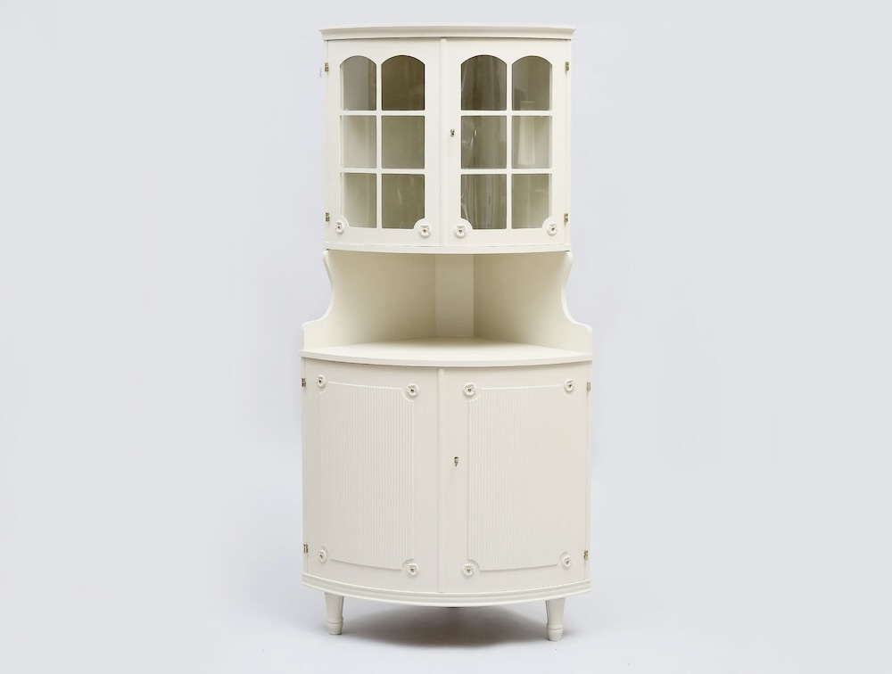Элегантный угловой буфет ( витрина), середина 1900 -х, густавианский стиль, красивый скандинавский декор, витражи, застекленная верхняя часть, точеные ножки, декор. Высота 175 cм, ширина 87 см, глубина 51 см . Ключи в наличии.