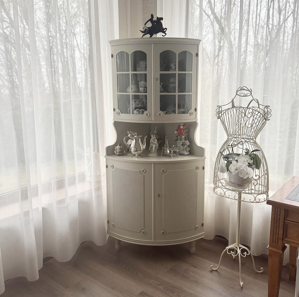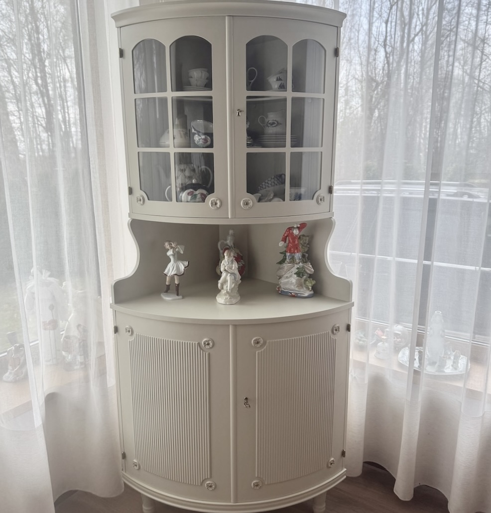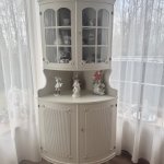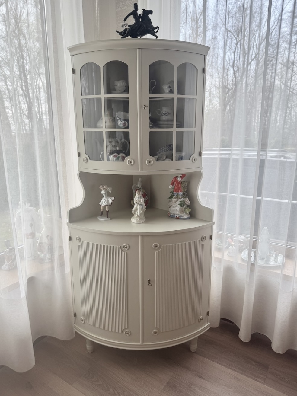 Элегантный угловой буфет ( витрина), середина 1900 -х, густавианский стиль, красивый скандинавский декор, витражи, застекленная верхняя часть, точеные ножки, декор. Высота 175 cм, ширина 87 см, глубина 51 см . Ключи в наличии.