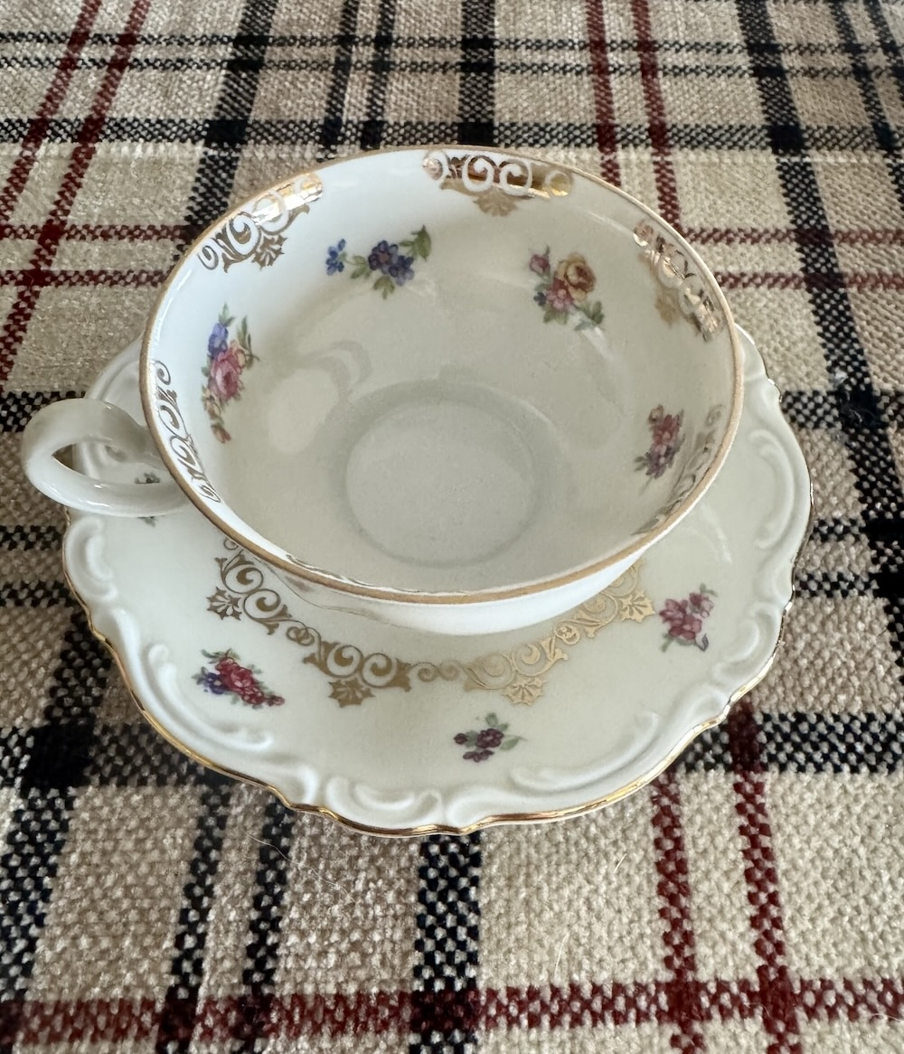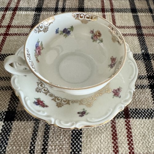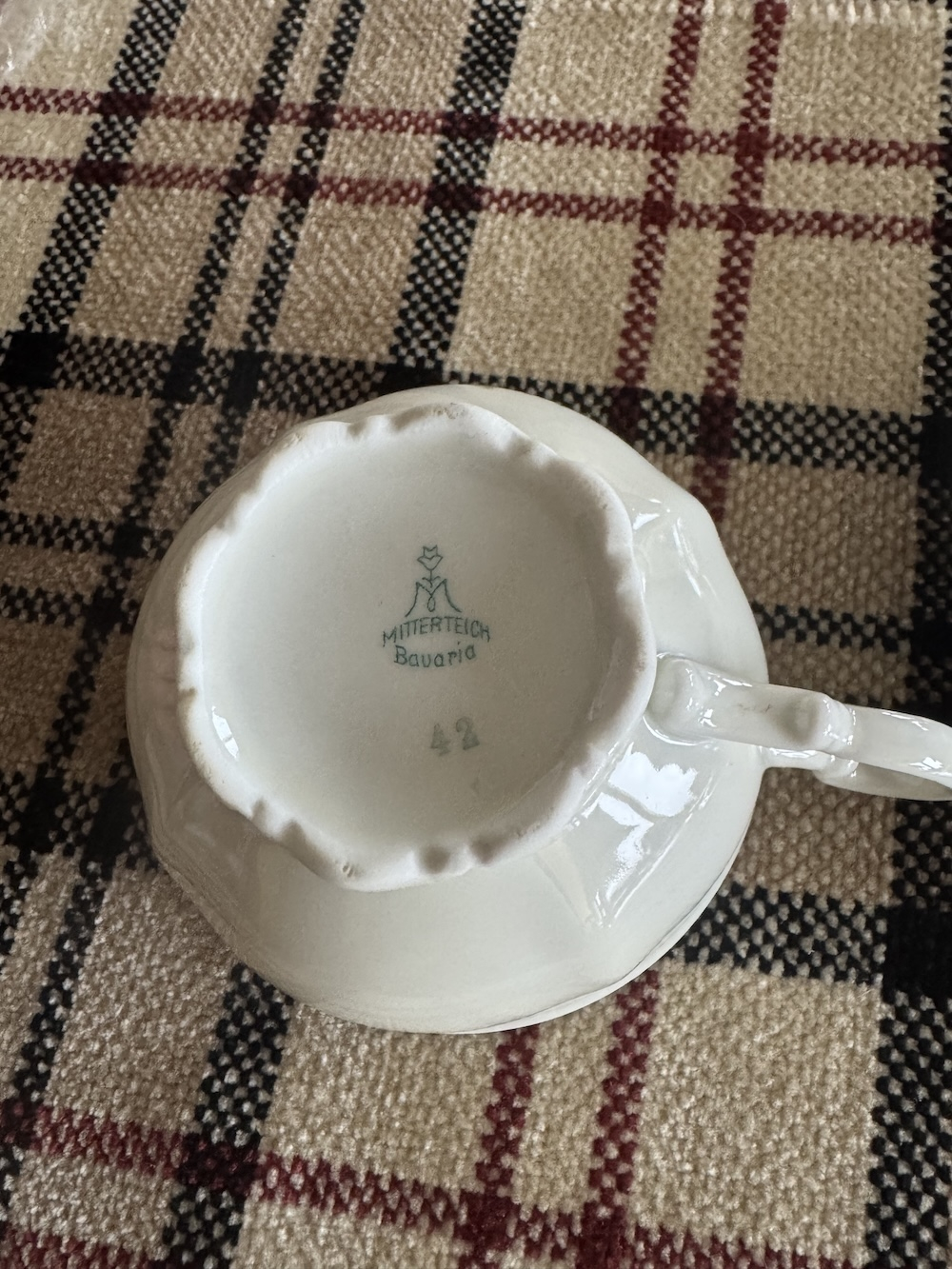 Изящная чайная пара от известной баварской мануфактуры Mitterteich. Украшена романтичным цветочным орнаментом с розами в розово-зелёной гамме и тонкой позолотой по краю. Маркировка на донышке: “Mitterteich Bavaria 86”. Клеймо 1931 - 1945 годов. Прекрасное состояние, без сколов и трещин. Подходит для сервировки, подарка и коллекционирования. В наличии 6 пар.Цена указана за 1 пару
