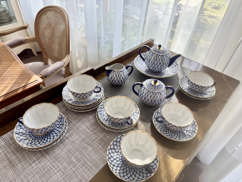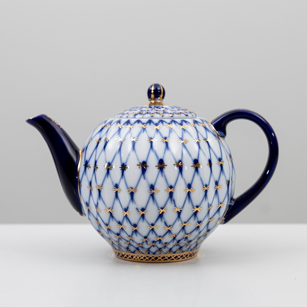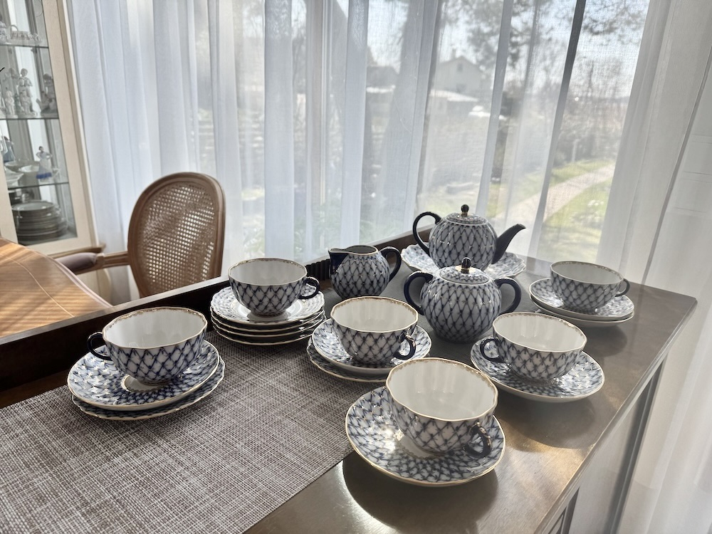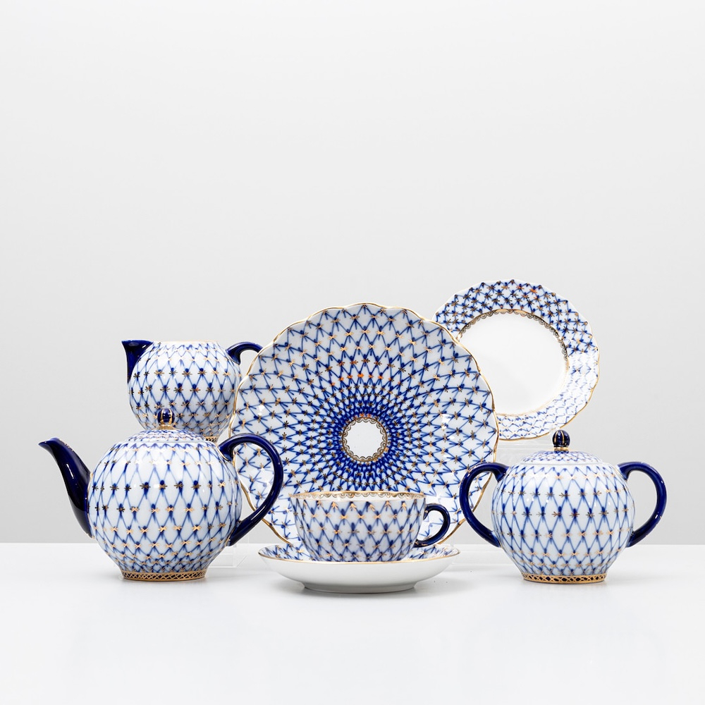 Чайный ( полный) сервиз знаменитого на весь мир рисунка, созданного в послеблокадном Ленинграде в 1944 году художницей Анной Яцкевич "Кобальтовая сетка", Ломоносовского завода с клеймом MADE IN USSR (делалось на экспорт ) на 6 персон (6 чашек, 6 блюдец) , чайник, молочник, сахарница, сухарница, а также 6 пирожковых тарелок. Объем чашек 250 мл, диаметр блюдца 15 см, объем чайника 700 мл. Ручная раскраска, не стертая позолота.