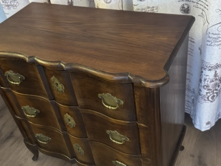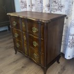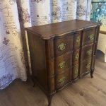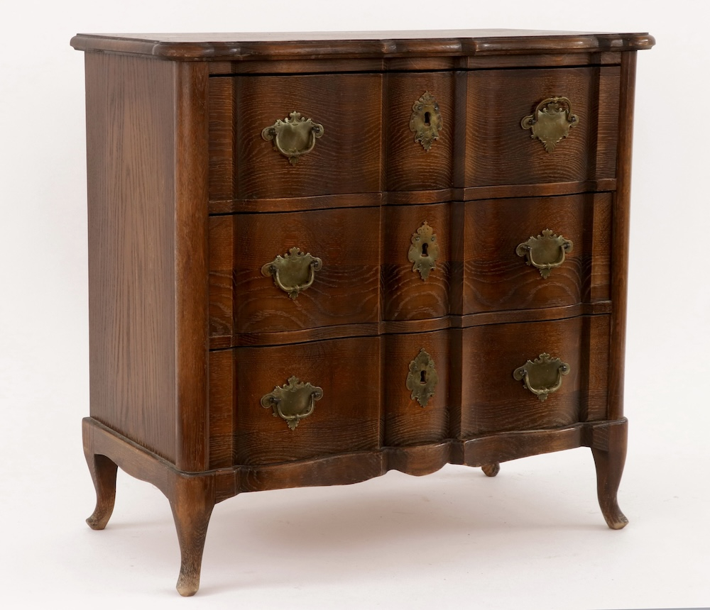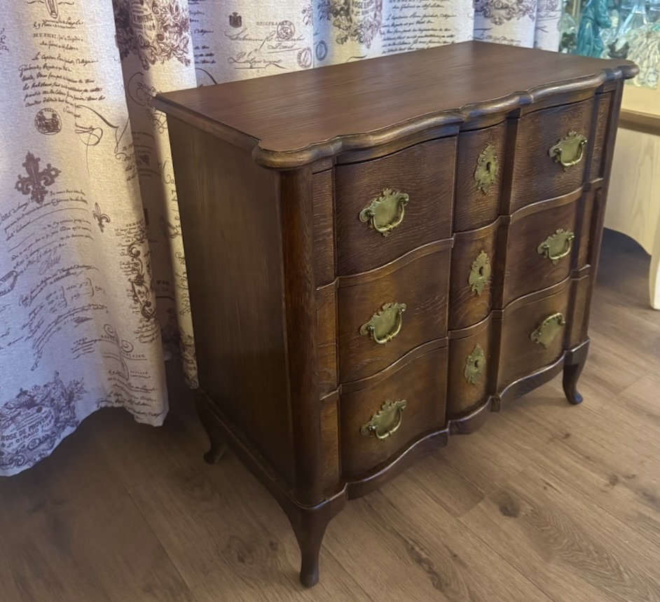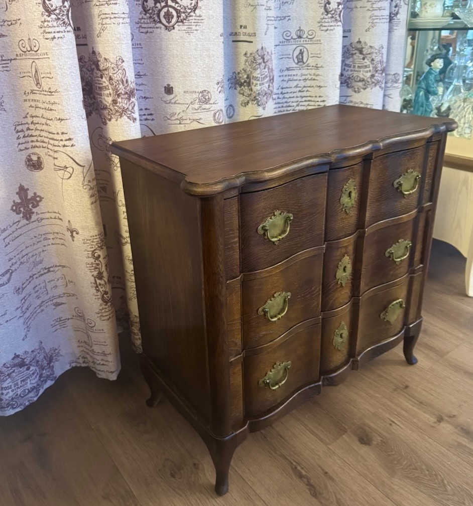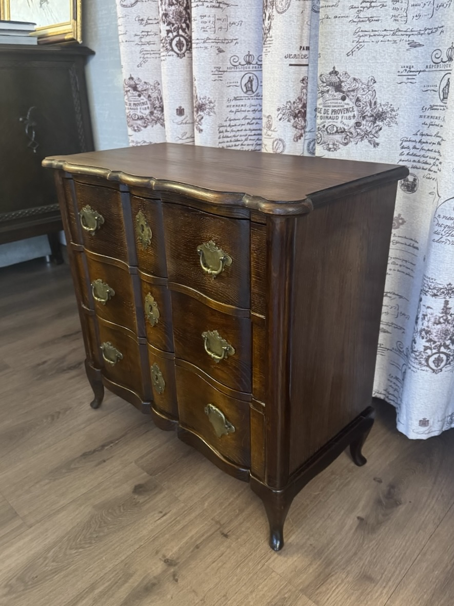 Элегантный антикварный дубовый комод небольшого размера с 3 выдвижными ящиками, начало 20-го века. Изогнутые ноги, латунные накладки, сложная форма. Высота 66 см, ширина 68 см, глубина 34 см. Хорошее состояние.