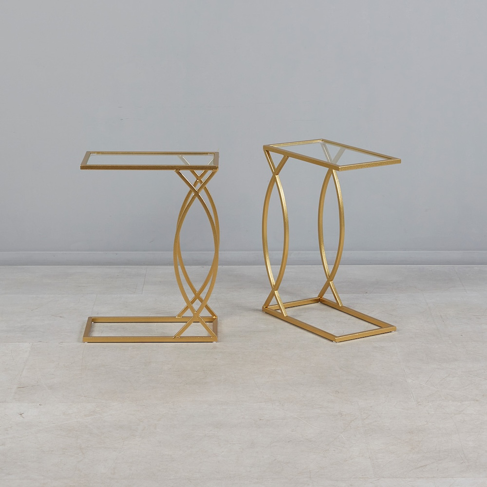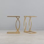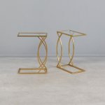 Пара винтажных приставных столика из позолоченного металла, сложной формы с изогнутыми ножками и стеклянной полкой каждая, высота 61 см, длина 45,5 см, ширина 25,5 см. Подойдут как консоли, прикроватные, придиванные, как сервировочные. Цена указана за один
