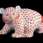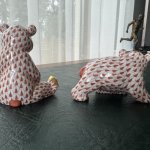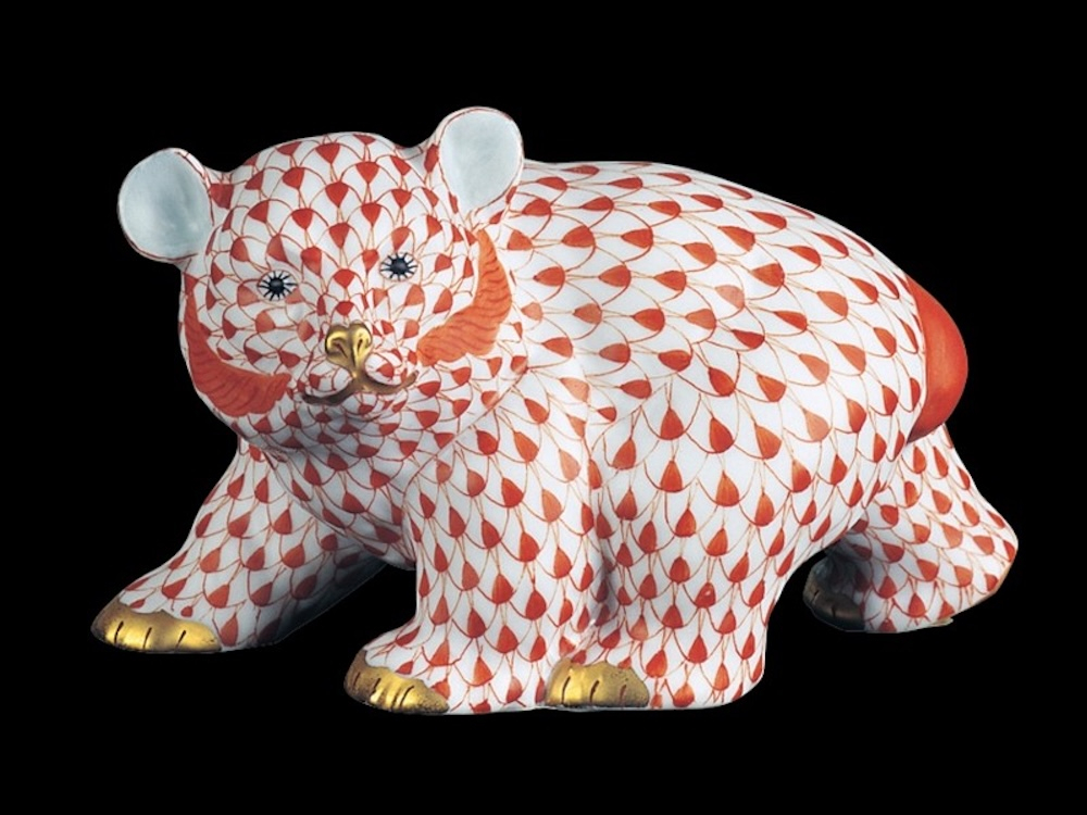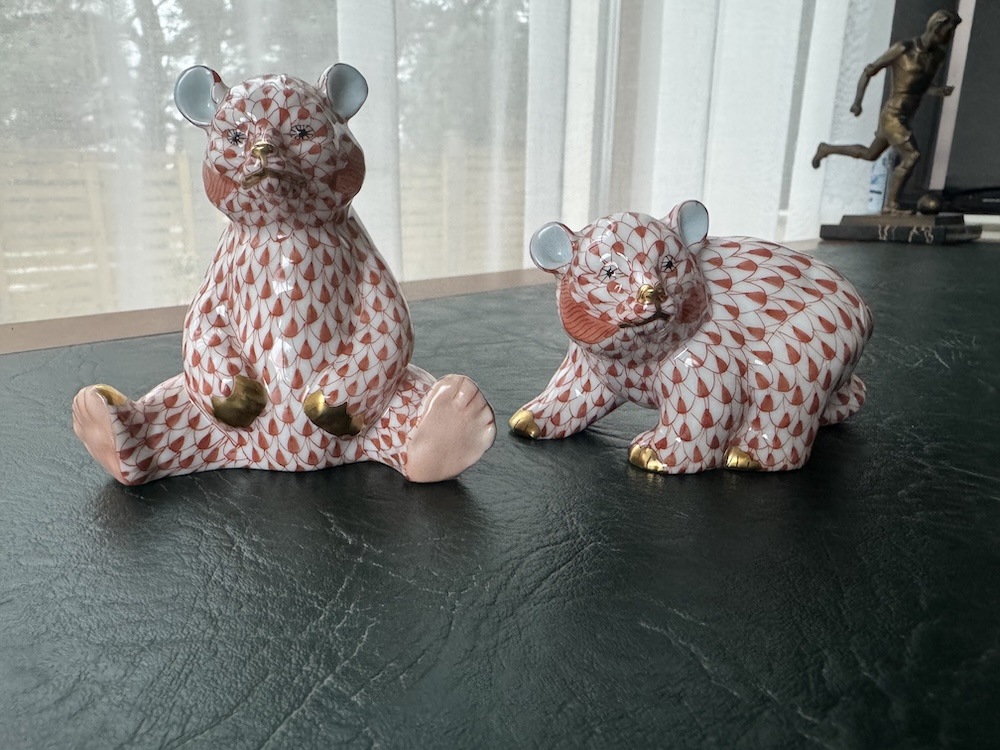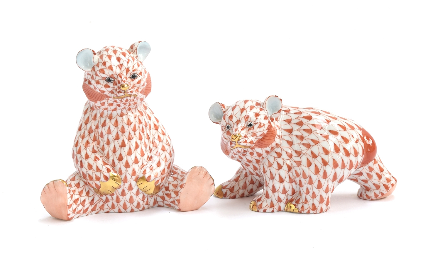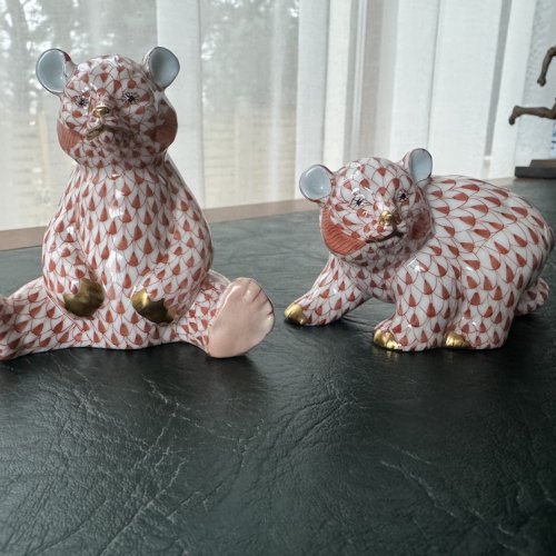 Редкая находка знаменитой мануфактуры Herend , два медвежонка "Baby Bear Sitting" и "Baby Bear Walking "c фирменным чешуйчатым узором с 24 каратным золотом . Подделать этот узор практически невозможно, поскольку узкие или расширяющиеся чешуйки можно нанести на неровные поверхности только вручную. Herend был поставщиком Королевского двора, а также изготавливал изделия для императора Франца-Иосифа, королевы Виктории, Ротшильдов и других представителей аристократии.