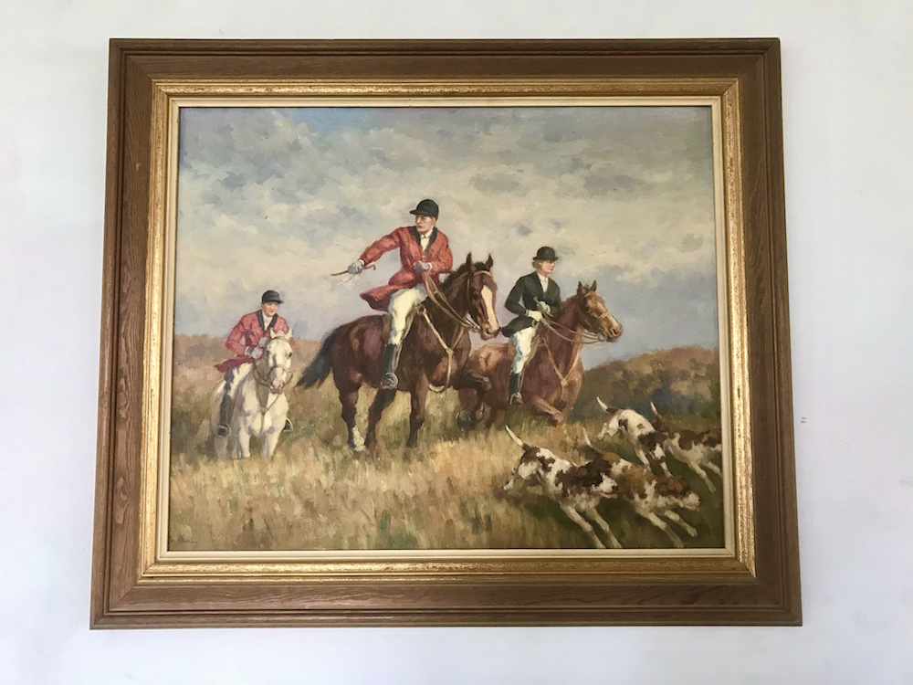 Великолепно написанная маслом на холсте картина с изображением сцены английской охоты на лис с охотничьими собаками и охотниками на лошадях, подпись художника в нижнем углу, обрамлена в раму. Размеры с рамой 76 см на 66 см, без рамы 50х61 см.